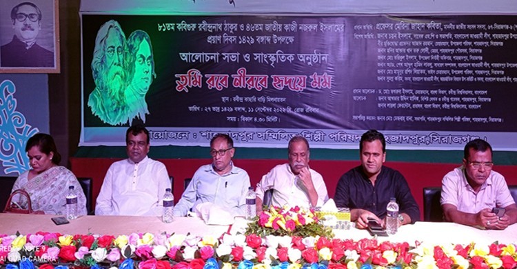 সিরাজগঞ্জ শাহজাদপুরে বিশ্বকবি রবীন্দ্রনাথ ঠাকুরের ৮১ তম ও জাতীয় কবি কাজী নজরুল ইসলাম এর ৪৬ তম প্রয়াণ দিবস স্মরণে গতরবিবার সন্ধ্যায় রবীন্দ্র কাছারি বাড়ি মিলনায়তনে শাহজাদপুর সম্মিলিত শিল্পী পরিষদের আয়োজনে আলোচনা সভা ও সাংস্কৃতিক অনুষ্ঠান " তুমি রবে নীরবে হৃদয়ে মম " অনুষ্ঠিত হয়েছে।