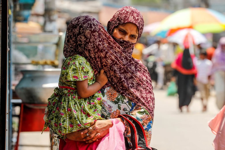 খরতাপে রোদ থেকে শিশুসন্তানকে বাঁচাতে নিজের ওড়না দিয়ে তাকে ঢেকে রেখেছেন মা। সোনাডাঙ্গা বৌ বাজার, খুলনা শহর, ২৬ এপ্রিলছবি: সাদ্দাম হোসেন