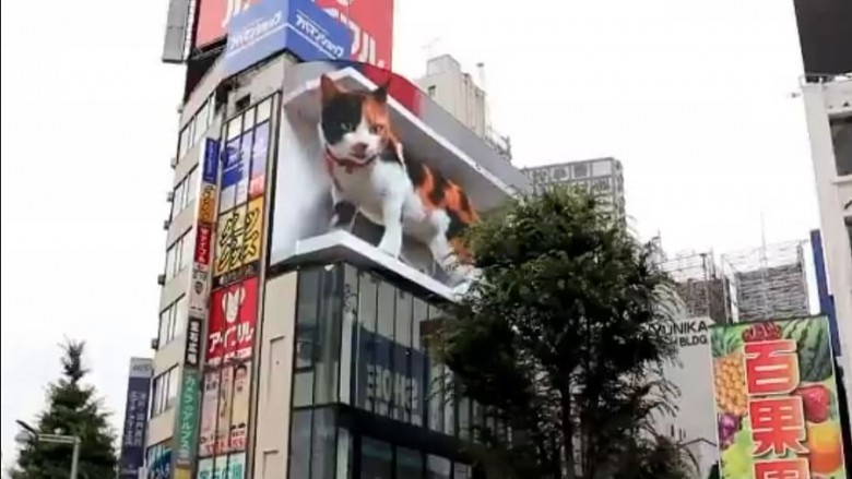 টোকিওর ব্যস্ততম রেলস্টেশনের কাছে বিশালাকৃতির একটি বিড়ালের থ্রিডি বিলবোর্ড সবাইকে চমকে দিয়েছে। ১৬৬৪ বর্গফুট এলইডি ডিসপ্লের ওই বিলবোর্ডটিতে বিজ্ঞাপনের ফাঁকে ফাঁকে বিড়ালটির উপস্থিতি যেন বাস্তব উপস্থিতি ফুটিয়ে তোলে। ফোর-কে রেজল্যুশনের পর্দায় জাপানের রাজধানীর উঁচুতে থাকা বিড়ালটিকে দেখে মনে হয়, সে ডাকতে পারবে। যুক্তরাষ্ট্রের সম্প্রচারমাধ্যম সিএনএনের এক প্রতিবেদনে এ তথ্য জানানো হয়েছে।
