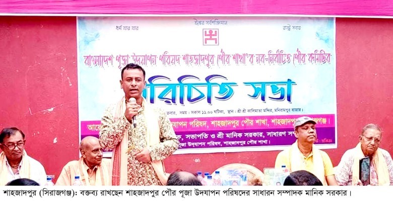 জানা গেছে, গত ১২ এপ্রিল শাহজাদপুর রবীন্দ্র কাছারিবাড়ি মিলনায়তনে অনুষ্ঠিত বাংলাদেশ পূজা উদযাপন পরিষদ শাহজাদপুর পৌর শাখার দ্বি-বার্ষিক সম্মেলনে রতন কুমার বসাক সভাপতি ও বিশিষ্ট ব্যবসায়ী মানিক সরকার সাধারন সম্পাদক নির্বাচিত হন। পরে নবনির্বাচিত সভপতি ও সাধারন সম্পাদকের নেতৃত্বে ৫১ সদস্যবিশিষ্ট পূর্ণাঙ্গ কমিটি গঠিত হয়। এতে সহ-সভাপতি পদে বলদেব সাহা, রাম সরকার, উত্তম কুমার দত্ত, অসীম ভট্টাচার্য, তুষার কান্তি সাহা, যুগ্ম-সাধারন সম্পাদক পদে কৃষ্ণ কুমার সূত্রধর, রবীন্দ্রনাথ দাস, কোষাধ্যক্ষ পদে রামচন্দ্র ফৌজদার, সহ-কোষাধ্যক্ষ পদে মানিক কুমার দেব, সাংগঠনিক সম্পাদক পদে দীপক মুখার্জী, সহ-সাংগঠনিক সম্পাদক রাজেশ দত্ত, দপ্তর সম্পাদক পদে অসীম কুমার রায়, আইন বিষয়ক সম্পাদক পদে তপন কুমার বসাক, প্রচার সম্পাদক পদে ভরত সাহা, গণসংযোগ সম্পাদক পদে পার্থ সাহা, গ্রন্থনা ও প্রকাশনা সম্পাদক পদে সুব্রত মুখার্জী (লিখন), সাংস্কৃতিক সম্পাদক পদে সমির কুমার দত্ত, সমাজকল্যাণ সম্পাদক পদে রনি বসাক, ধর্মীয় প্রতিষ্ঠান সংরক্ষণ সম্পাদক পদে ধীরেন্দ্রনাথ দাস, মহিলা সম্পাদক পদে দীপিকা রানী সাহা, পূজা সম্পাদক পদে দিলিপ গোস্বামী ও সহ-পূজা সম্পাদক পদে গৌরাঙ্গ সাহা নির্বাচিত হন। শাহজাদপুর পৌর পূজা উদযাপন পরিষদের ৫১ সদস্য বিশিষ্ট পূর্ণাঙ্গ কমিটি গঠনের পর এদিন এ পরিচিতি সভা অনুষ্ঠিত হয়।