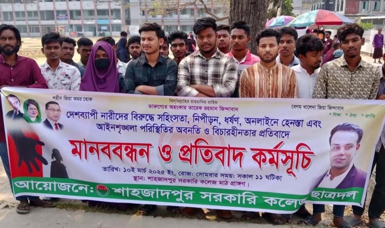 সারাদেশের নারীদের সহিংসতা, নিপীড়ন, ধর্ষণ, অনলাইনে ইভটিজিং এবং আইনশৃঙ্খলা পরিস্থিতি অবনতি ও বিচারহীনতার প্রতিবাদে শাহজাদপুর সরকারী কলেজ ছাত্রদলের উদ্যোগে মানববন্ধন ও প্রতিবাদ কর্মসুচি পালন করা হয়েছে।