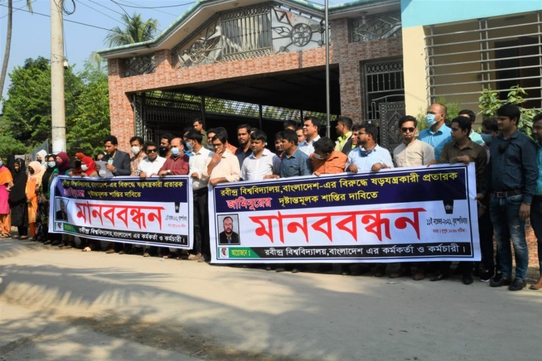 এ বিষয়ে রবীন্দ্র বিশ্ববিদ্যালয়ের পাবলিক রিলেশন অফিসার মো: শাহ আলী স্বাক্ষরিত সংবাদ বিজ্ঞপ্তিতে জানানো হয়, গত ২০১৮ সালের ফেব্রæয়ারি মাসে বিশ্ববিদ্যালয় কর্তৃক প্রচারিত কর্মকর্তা নিয়োগ বিজ্ঞপ্তি অনুযায়ী পরিচালক (পরিকল্পনা ও উন্নয়ন) পদে আবেদন করেন জনৈক জামিনুর রহমান। সংশ্লিষ্ট পদে যোগ্যতা ও অভিজ্ঞতা না থাকায় জামিনুর রহমানের আবেদনপত্রটি বাতিল করা হয়। এর প্রেক্ষিতে, জামিনুর রহমান রবীন্দ্র বিশ্ববিদ্যালয়ের অনুমোদন, ভাইস চ্যান্সেলর নিয়োগসহ অন্যান্য জনবল নিয়োগের বৈধতা, বিশ্ববিদ্যালয় বন্ধের দাবীসহ সকল কার্যক্রমকে চ্যালেঞ্জ করে উচ্চ আদালতে রিট পিটিশন দাখিল করে। পরবর্তীতে, তিনি একই অভিযোগ তুলে বিশ্ববিদ্যালয় মঞ্জুরী কমিশন, দুর্নীতি দমন কমিশন, শিক্ষা মন্ত্রনালয়সহ নানা গণমাধ্যমে বিভ্রান্তিকর তথ্য প্রদান করেন যা বিশ্ববিদ্যালয়ের একাডেমিক ও প্রশাসনিক কার্যক্রম পরিচালনায় মারাত্বকভাবে বাধাগ্রস্থ্য করছে। এরই প্রতিবাদে ও ষড়যন্ত্রকারী জনৈক জামিনুর রহমানের দৃষ্টান্তমূলক শাস্তির দাবীতে বিশ্ববিদ্যালয়ের প্রায় দেড় শতাধিক কর্মকর্তা কর্মচারীরা মানববন্ধন করে। মানববন্ধনে অন্যান্যের মধ্যে অংশগ্রহণ করেন, রবীন্দ্র বিশ্ববিদ্যালয়ের সহকারী রেজিস্টার শেখ আল মাহমুদ, সহকারী পরীক্ষা নিয়ন্ত্রক আনোয়ার হোসেন, পাবলিক রিলেশন অফিসার মো: শাহ আলী, সেকশন অফিসার ওবায়দুল হক, শাহ নেওয়াজ চৌধুরী, সাদিয়া জেবিন, সানজিদা হকসহ অন্যান্য কর্মকর্তা কর্মচারীরা।