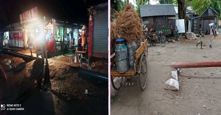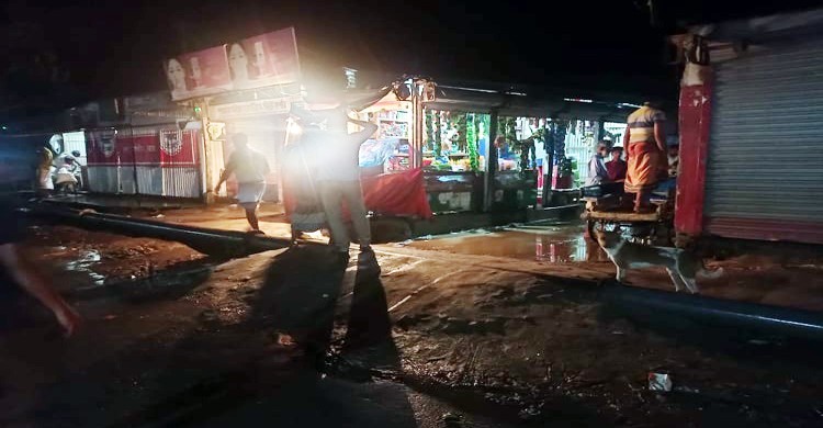 এ ভাবেই রাস্তা আটকিয়ে টানানো হয়েছে পাইপ