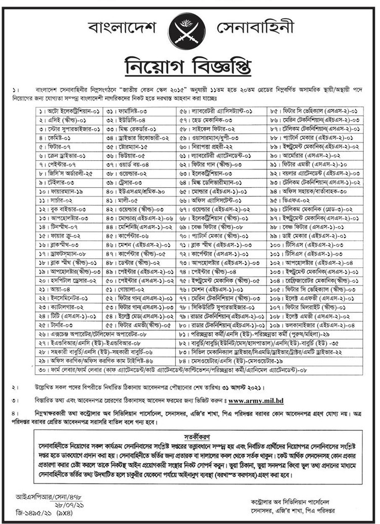বাংলাদেশ সেনাবাহিনী সম্প্রতি নিয়োগ বিজ্ঞপ্তি দিয়েছে। এতে সিভিলিয়ান শাখায় ১১তম হতে ২০তম গ্রেডে লোকবল নিয়োগ দেওয়া হবে। বিজ্ঞপ্তির নির্দেশনা অনুসারে আবেদন করতে হবে বিভিন্ন সেনানিবাসে। তবে সেনাসদর দফতরে আদেনপত্র পাঠালে গ্রহণযোগ্য হবে না।