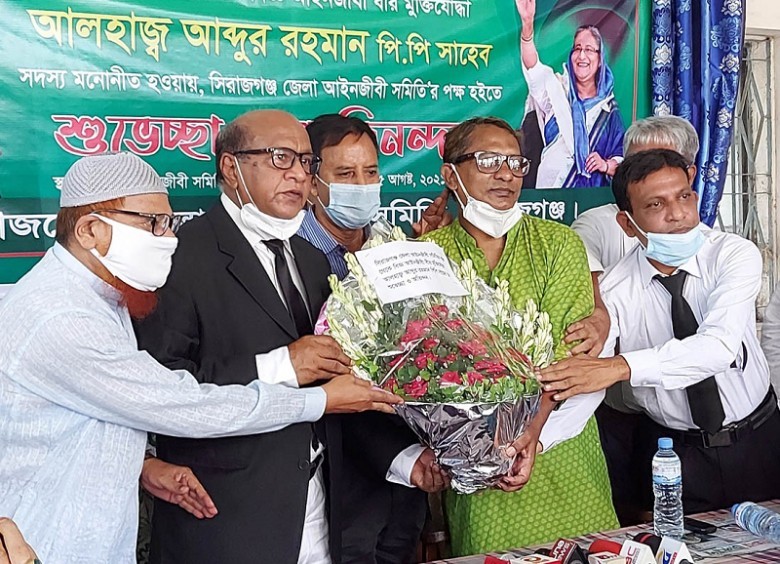 বাংলাদেশ বার কাউন্সিলের নব গঠিত এ্যাডহক কমিটির সদস্য নির্বাচিত হওয়ায় সিরাজগঞ্জ আদালতের পাবলিক প্রসিকিউটর(পিপি), সিরাজগঞ্জ জেলা আওয়ামীলীগের সিনিয়র সহ সভাপতি বীর মুক্তিযোদ্ধা আলহাজ এ্যাডভোকেট আব্দুর রহমানকে বৃহস্পতিবার সকালে সিরাজগঞ্জ জেলা আইনজীবী সমিতির পক্ষ থেকে ফুল দিয়ে শুভেচ্ছা ও সংবর্ধনা জানানো হয়।