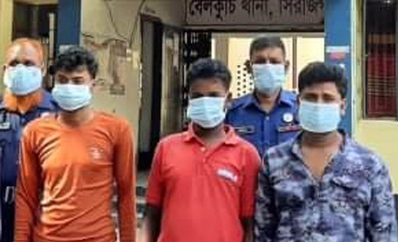 এরা হল, সিরাজগঞ্জের শাহজাদপুর উপজেলার চরনরিনা গ্রামের জহুরুল প্রামানিকে ছেলে শাহদাত হোসাইন (২৮), মুবারক সরকারের ছেলে ফারুক আহমেদ(২৯) ও বেলায়েত প্রামানিকের ছেলে বরাত আলী বাবু (২৮)। তথ্য প্রযুক্তির সাহায্যে বেলকুচি থানা পুলিশ শাহজাদপুর উপজেলার চরনরিনা এলাকায় অভিযান চালিয়ে এদেরকে গ্রেপ্তার করে।