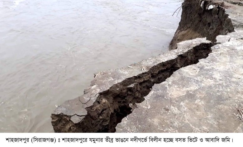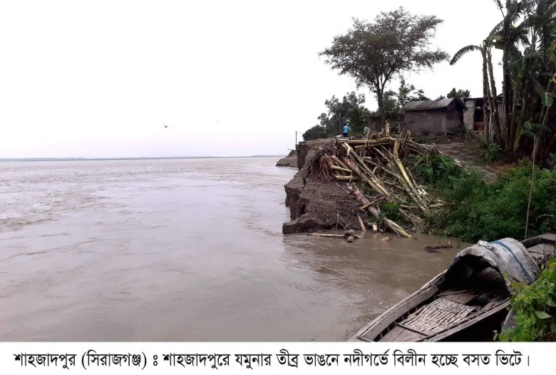 বর্ষার শুরুতেই উজানের ঢলে যমুনা নদীতে অব্যাহত ভাবে পানি বৃদ্ধির ফলে সিরাজগঞ্জের শাহজাদপুরে অরক্ষিত নদী তীরবর্তী অঞ্চলগুলোতে শুরু হয়েছে ব্যাপক ভাঙন। এলাকাবাসীর দাবী ইতোমধ্যেই কয়েকদিনের ভাঙনে যমুনার ঘোলা জলে তলিয়ে গেছে অর্ধশতাধিক বাড়িঘর ও বিস্তির্ণ ফসলের মাঠ। অপরদিকে ঠিকাদার প্রতিষ্ঠানের গড়িমসি এবং অব্যবস্থাপনার কারনে যমুনার বাঁধ নির্মাণ প্রকল্প এলাকাতেও দেখা দিয়েছে ভাঙন। কলকল শব্দে অবিরত বয়ে যাওয়া যমুনা এখন তীরবর্তী জনবসতির জন্য বিরাট আতঙ্কের নাম। মাঝেই মাঝেই নদীর স্বভাব-সুলভ হুংকারে কেঁপে উঠছে জনগণ। কিছুক্ষণ পর পরই ধপাস করে বিকট আওয়াজ তুলে হৃদয় কাপিয়ে দিয়ে যমুনার ঘূর্ণিতে তলিয়ে যাচ্ছে স্বপ্নের বসতভিটা।