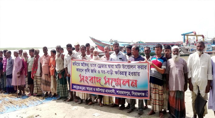 সিরাজগঞ্জ শাহজাদপুর উপজেলায় যমুনা নদী থেকে অবৈধভাবে ড্রেজার দিয়ে বালু উত্তোলন বন্ধের জন্য প্রশাসন বরাবর লিখিত অভিযোগ দিয়েও প্রতিকার না পেয়ে শুক্রবার(২৩জুন) সকালে উপজেলার কৈজুরী ইউনিয়নের ভাটপাড়া গ্রামে কৃষি জমি ও ঘর-বাড়ী রক্ষার দাবিতে সংবাদ সম্মেলন, বিক্ষোভ মিছিল ও মানববন্ধন করেছেন আড়রা ও ভাটপাড়া গ্রামের সহস্রাধিক ক্ষতিগ্রস্ত নদী পাড়ের মানুষ।