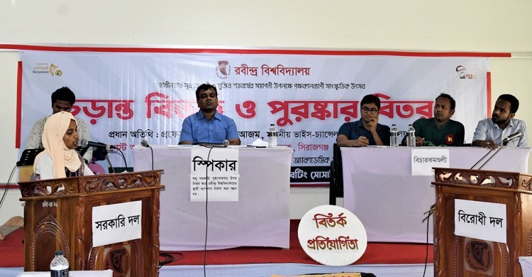সিরাজগঞ্জ শাহজাদপুরে গতরবিবার(২৭ মার্চ) রবীন্দ্র বিশ্ববিদ্যালয়ের বিতর্ক প্রতিযোগিতার চূড়ান্ত পর্ব অনুষ্ঠিত হয়েছে। উক্ত বিতর্ক প্রতিযোগিতা শেষে বিজয়ীদের মধ্যে প্রধান অতিথি হিসেবে উপস্থিত থেকে পুরস্কার বিতরণ করেন বিশ্ববিদ্যালয়ের উপাচার্য প্রফেসর ড. মোঃ শাহ্ আজম এবং গেস্ট অব অনার হিসেবে উপস্থিত ছিলেন সিরাজগঞ্জ জেলা প্রশাসক ড. ফারুক আহাম্মদ।