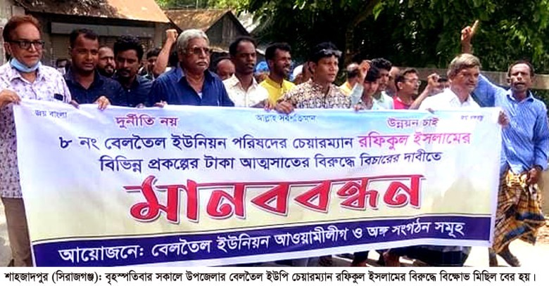 কাজ না করেই শাহজাদপুর উপজেলার বেলতৈল ইউনিয়ন পরিষদের অনুকূলে বরাদ্দকৃত ৫ টি প্রকল্পের ৬ লাখ ২৩ হাজার সরকারিংং টাকা আত্মসাতের অভিযোগে বেলতৈল ইউপি চেয়ারম্যান রফিকুল ইসলামের বিচারের দাবীতে বিক্ষোভ মিছিল ও মানববন্ধন করেছে বেলতৈল ইউনিয়ন আওয়ামী লীগের নেতাকর্মীসহ এলাকাবাসী।