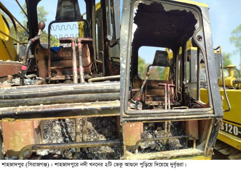 বাংলাদেশ সেনাবাহিনীর আওতাধীন সরকারি ভাবে সিরাজগঞ্জের শাহজাদপুর উপজেলার বাঙ্গালী, করতোয়া, ফুলজোড়, হুরাসাগর নদী সিস্টেম ড্রেজিং/পুনঃ খননসহ তীর সংরক্ষণ প্রকল্পের ঠিকাদারী প্রতিষ্ঠান কনফিডেন্স ইনফ্রাস্ট্রাকচার লিমিটেডের ২টি এক্সভেটর (ভেকু মেশিন) ভাংচুর করে আগুনে পুড়িয়ে দিয়েছে একদল চিহ্নিত দুর্বৃত্তরা। এ সময় ভেকুর মধ্যে থাকা ১টি ডায়নামা, ২ ব্যারেল ডিজেল, গ্রিজগান ও ৬০ কেজি গ্রিজসহ ৩ লাখ টাকার মালামালও চুরি করে নিয়ে যায় দুর্বৃত্তরা। এ কাজে বাধাদান করায় বাবু লাল নামের ১ এলাকাবাসীকে পিটিয়েও আহত করে দুর্বৃত্তের দল। এতেও ক্ষান্ত না হয়ে ওই দুর্বৃত্তের দল এলাকার হাজী সাইদুল ইসলাম নামের অপর এক গ্রামবাসীর বাড়িঘর ভাংচুর করে ১ লাখ টাকার ক্ষতিসাধন করে। এ ঘটনায় কনফিডেন্স ইনফ্রাস্ট্রাকচার লিমিটেডের ঠিকাদার কাজী রেজওয়ানুল জান্নাত বাদী হয়ে ৯ জনের নাম উল্লেখ করে অজ্ঞাতনামা আরও ৫০/৬০ জনের বিরুদ্ধে শাহজাদপুর থানায় একটি মামলা দায়ের করেছেন। ঘটনাটি ঘটেছে শাহজাদপুর পৌর এলাকার প্রাণনাথপুর চর এলাকায়।