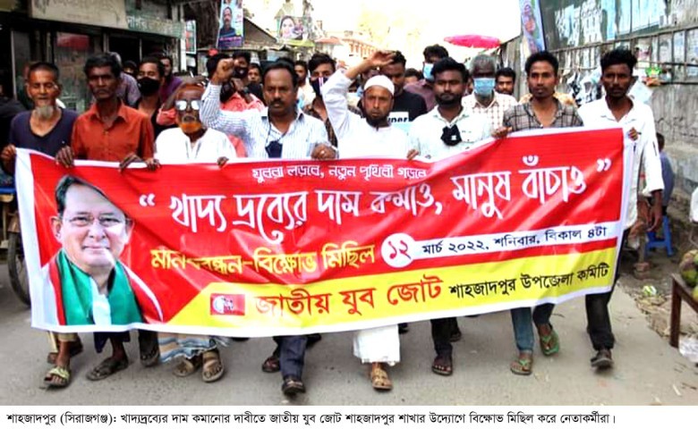 ‘খাদ্যদ্রব্যের দাম কমাও, মানুষ বাঁচাও’ এ শ্লোগানকে সামনে রেখে শাহজাদপুরে চাল, ডাল, তেলসহ নিত্যপ্রয়োজনীয় খাদ্যের দাম কমানোর দাবীতে বিক্ষোভ মিছিল ও মানববন্ধন করেছে জাতীয় যুব জোট শাহজাদপুর উপজেলা শাখা।