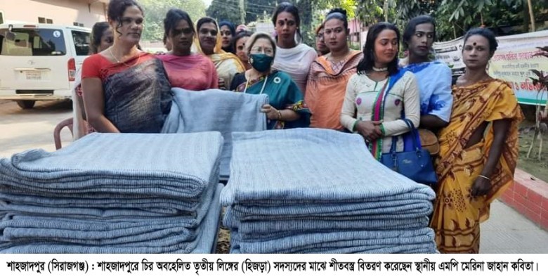 সিরাজগঞ্জের শাহজাদপুরে চির অবহেলিত তৃতীয় লিঙ্গের (হিজড়া) সদস্যসহ দুঃস্থ শীতার্ত আমজনতার মাঝে শীতবস্ত্র বিতরণ করেছেন সিরাজগঞ্জ-৬ (শাহজাদপুর) আসনের এমপি ও বাংলাদেশ আওয়ামী লীগ কেন্দ্রীয় কার্যনির্বাহী কমিটির অন্যতম সদস্য প্রফেসর মেরিনা জাহান কবিতা। শনিবার (২৫ ডিসেম্বর) রাতে শাহজাদপুর পৌর এলাকার বিভিন্ন স্থানে প্রকৃত অসহায় শীতার্ত মানুষকে খুজে বের করে তাদের হাতে শীতবস্ত্র হিসেবে কম্বল তুলে দেন স্থানীয় এমপি প্রফেসর মেরিনা জাহান কবিতা। এছাড়া, এদিন দুপুরে উপজেলার পৌর সদরের শক্তিপুর মহল্লার নূরজাহান ভবনে সমাজের চির অবহেলিত, চির পতিত, চির বঞ্চিত, চির অপাংক্তেয় ২৫ হিজড়াদের হাতে শীতবস্ত্র তুলে দেন শাহজাদপুরের মাটি ও মানুষের নেতা প্রফেসর মেরিনা জাহান কবিতা এমপি।