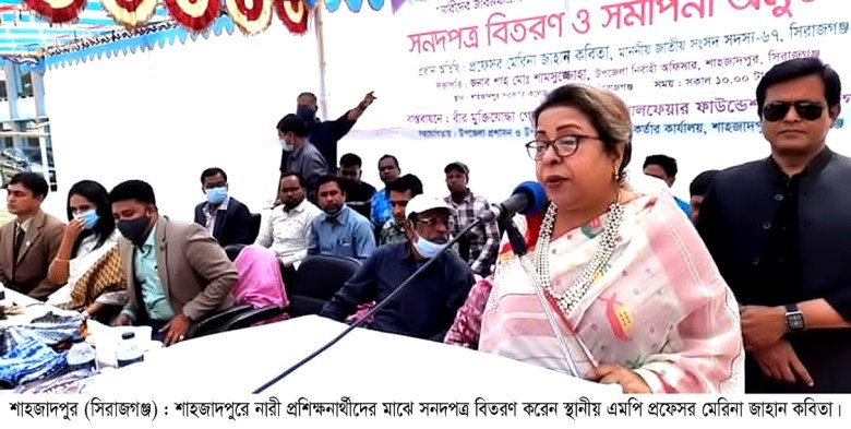 জীবনযাত্রার মানোন্নয়ন ও নারীদের আয় বৃদ্ধিম‚লক কর্মস‚চীর আওতায় প্রশিক্ষণার্থীদের মাঝে সনদ ও ভাতা প্রদান করা হয়েছে। মঙ্গলবার (১ লা মার্চ) বেলা ১১ টায় শাহজাদপুর সরকারি কলেজ মাঠে গোলাম কিবরিয়া ফাউন্ডেশন কর্তৃক আয়োজিত সনদ বিতরন ও সমাপনী অনুষ্ঠানে প্রধান অতিথি হিসেবে উপস্থিত থেকে সনদপত্র বিতরণ করেন সিরাজগঞ্জ-৬ (শাহজাদপুর) আসনের এমপি ও বাংলাদেশ আওয়ামী লীগ কেন্দ্রীয় কার্যনির্বাহী কমিটির সদস্য প্রফেসর মেরিনা জাহান কবিতা।