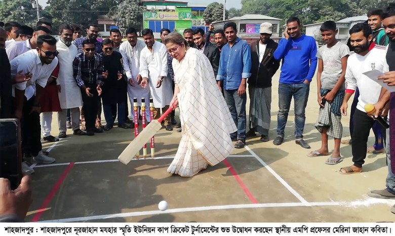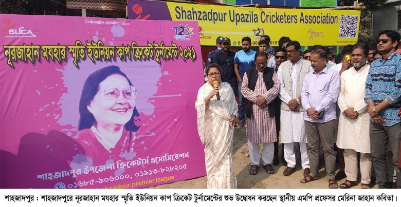 সিরাজগঞ্জের শাহজাদপুরে নূরজাহান মযহার স্মৃতি ইউনিয়ন কাপ টি-টুয়েন্টি ক্রিকেট টুর্নামেন্টের শুভ উদ্বোধন করা হয়েছে। শুক্রবার সকালে শাহজাদপুর সরকারি মডেল পাইলট হাইস্কুল মাঠে শাহজাদপুর উপজেলা ক্রিকেটার্স এ্যাসোসিয়েশন কর্তৃক আয়োজিত উদ্বোধনী অনুষ্ঠানে প্রধান অতিথি হিসেবে উপস্থিত থেকে ক্রিকেট টুর্নামেন্ট উদ্বোধন করেন কেন্দ্রীয় আওয়ামী লীগের কার্যনির্বাহী কমিটির সদস্য স্থানীয় এমপি প্রফেসর মেরিনা জাহান কবিতা। উদ্বোধনী অনুষ্ঠানের প্রধান অতিথি প্রফেসর মেরিনা জাহান কবিতা বলেন, ‘এ স্কুল মাঠে ক্রীড়া ব্যতিত অন্য কিছু আর হতে দেয়া হবে না। খেলার মধ্যে রাজনীতি চলবে না। এ মাঠের উন্নয়নে সব ধরনের সহযোগীতা দেয়া হবে। ভবিষ্যতে, আমার রত্নগর্ভা মা নূরজাহান মযহারের নামে অনুষ্ঠিতব্য ক্রিকেট টুর্নামেন্ট ব্যাপক পরিসরে আয়োজন করা হবে।’