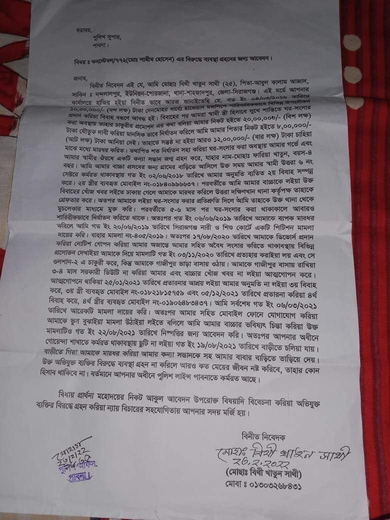 শনিবার (১১ জুন) দুপুরে পুলিশ কনষ্টেবল শামীম হোসেন ওরফে ফিরোজের প্রথম স্ত্রী বিথী বেগম (২৩) সাংবাদিকদের অভিযোগে জানান, আলোকদিয়ার গ্রামের শামীম হোসেন ওরফে ফিরোজের সাথে ২০১৬ সালে পারিবারিকভাবে নগদ ৮ লাখ টাকা ও আসবাবপত্র, প্রদান করে ১০ লক্ষ টাকা কাবিনে তার বিয়ে সম্পন্ন হয়। বিয়ের পর শশুর বাড়ীতেই অবস্থান করতে থাকে। এরপর বিথী গর্ভধারন করলে পার্শ্ববর্তী শাকতোলা গ্রামে বাবার ভাড়া বাসায় অবস্থান করতে থাকে। এ ফাঁকে এক কন্যা সন্তানের জন্ম হলে পুলিশ কনস্টেবল শামীম বিথীর সাথে যোগাযোগ বন্ধ করে দেয়। বেশ কিছুদিন পর বিথী জানতে পারে তার স্বামী ঢাকা উত্তরার হাসিনা আক্তার হাসি খাতুনকে বিয়ে করে সংসার করছে। খবর পেয়ে সেখানে ছুটে গেলে বিথী ও তার মাকে ব্যাপক মারপিট করে তারিয়ে দেয় শামীম। পরে থানা পুলিশের স্মরণাপন্ন হলে শামীমকে আটক করে থানায় নিয়ে যায়। পরিস্থিতি বেগতিক দেখে শামীম বিথীর সাথে সমাঝোতায় আসে। কিছুদিন স্বাভাবিকভাবে যোগাযোগ রক্ষা করে নাটোরের বাগাতিপাড়া উপজেলার ক্যামিলি আক্তারকে বিয়ে করে তাকে নিয়ে সংসার করতে থাকে। পুলিশ কনস্টেবল শামীমের একের পর এক বিয়ের খবরে বিক্ষুব্দ হলে প্রথম স্ত্রী বিথিকে ডিভোর্স প্রদান করে। এনিয়ে আদালতের স্মরণাপন্ন হলে পুনরায় বিথীকে আবারও স্ত্রী হিসেবে গ্রহণ করে সংসার করতে থাকে শামীম। এরপর শামীম পাবনা পুলিশ লাইনে বদলী হয়ে ঢাকা জেলার ভাটারা থানার চাঁদনী আক্তারকে চতুর্থ স্ত্রী হিসেবে বিয়ে করে বর্তমান তাকে নিয়েই সংসার করছে ।