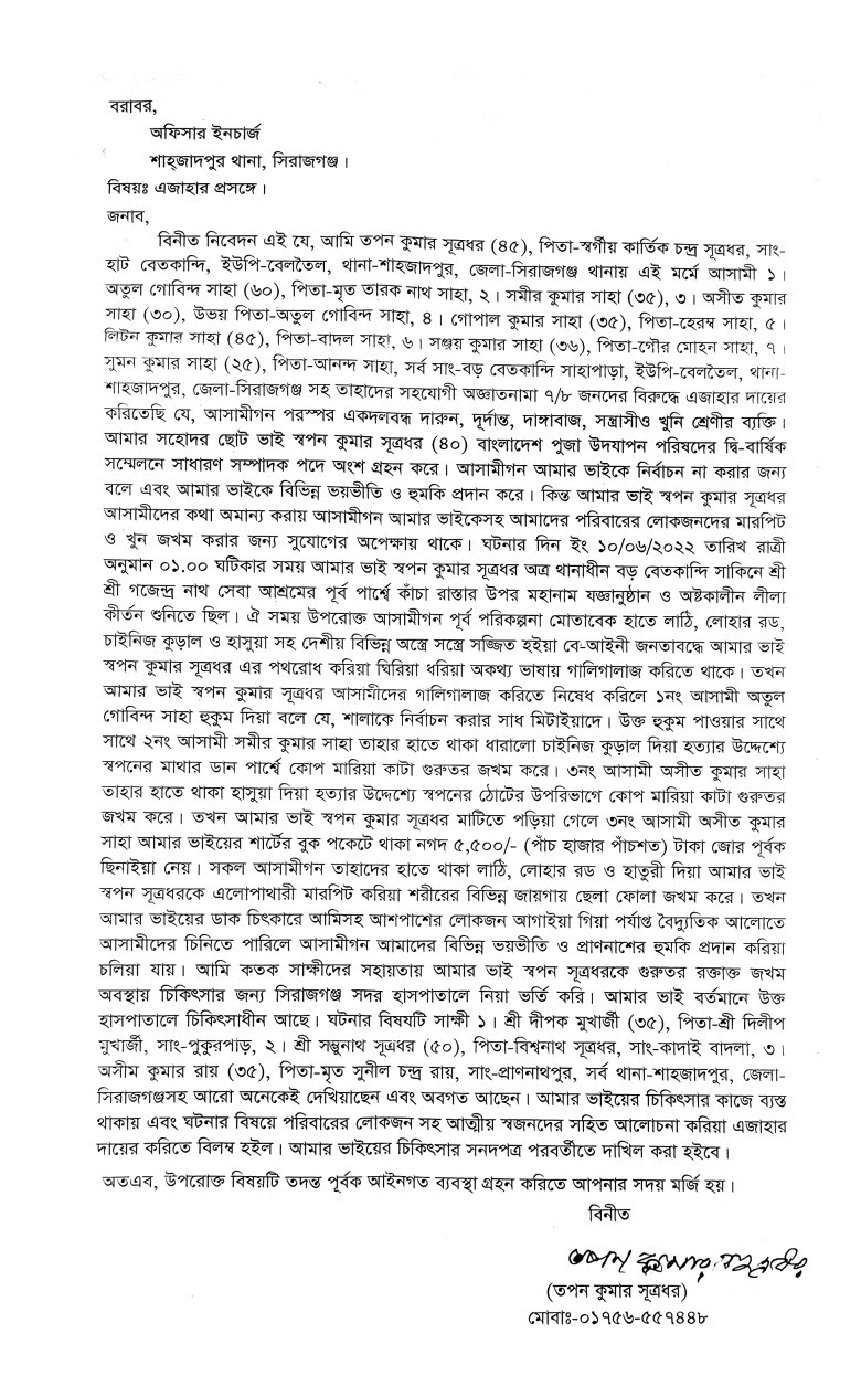 মামলা সূত্রে জানা যায়, উপজেলার বেলতৈল ইউনিয়নের বেতকান্দি গ্রামের মৃত কার্তিক চন্দ্র সুত্রধরের ছেলে কাঠমিস্ত্রি স্বপন কুমার সূত্রধর আসন্ন বাংলাদেশ পূজা উদযাপন পরিষদ বেলতৈল ইউনিয়নের দ্বি-বার্ষিক সম্মেলনে সাধারণ সম্পাদক পদপ্রার্থী হয় । স্বপন কুমার প্রার্থী হবার পর থেকেই নির্বাচন না করার জন্য অপর সাধারণ সম্পাদক প্রার্থীর সমর্থকেরা তার উপর ভয়ভীতি ও হুমকি দিয়ে আসছিল । কিন্তু স্বপন কুমার কারো ভয়ভীতির তোয়াক্কা না করে নির্বাচেন অংশগ্রহণ করলে এলাকার প্রভাবশালী বেলতৈল ইউনিয়ন পূজা উদযাপন পরিষদের সভাপতি অতুল গোবিন্দ সাহা গং গত বৃহস্পতিবার (৯ জুন) গভীর রাতে সাধারণ সম্পাদক প্রার্থী স্বপন কুমারের উপর হামলা চালিয়ে গরুতর আহত করে । এঘটনায় তার বড় ভাই তপন কুমার সূত্রধর বাদী হয়ে শনিবার (১২জুন) সন্ধ্যায় হামলাকারী অতুল গোবিন্দ সাহাসহ সাতজনকে নামীয় ও ৭/৮জনকে অজ্ঞাত আসামী করে শাহজাদপুর থানায় মামলা দয়ের করেন ।