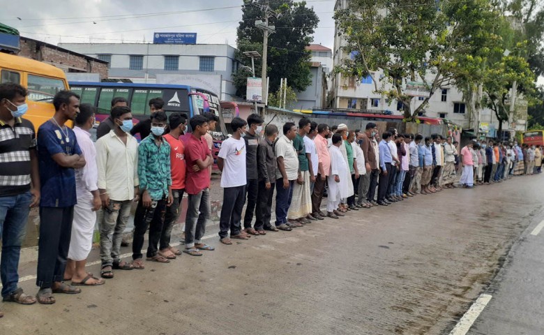 শাহজাদপুরে অবস্থিত সিরাজগঞ্জ জেলা বাস, মিনিবাস ও কোচ মালিক সমিতি কার্যালয়ে সংবাদ সম্মেলন শেষে বিসিক বাসস্ট্যান্ডের বগুড়া-নগরবাড়ি মহাসড়কে মানববন্ধন অনুষ্ঠিত হয়।
