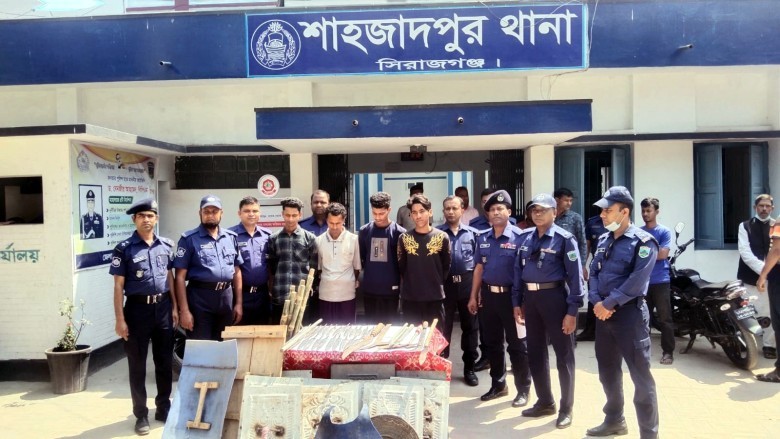 গতকাল বুধবার সকাল ১১টায় শাহজাদপুর থানা পুলিশ এক প্রেস বিজ্ঞপ্তিতে জানায়, উপজেলার উল্টাডাব গ্রামে জাকারিয়া রহম গ্রুপ ও সবুজ গ্রুপের মধ্যে দীর্ঘদিন যাবৎ বিরোধ চলে আসছে। পূর্ব বিরোধের কারণে পক্ষে বিপক্ষে খুন, পুলিশ আক্রান্ত মামলাসহ ২৪/২৫ টি মামলা রুজু হয়েছে এবং বিজ্ঞ আদালতে বিচারাধীন রয়েছে। গত ১৪ মার্চ গোপনসূত্রে জানতে পারি উল্টাডাব গ্রামে ঐ দুপক্ষ পুনরায় খুন খারাপিসহ মারামারি করার জন্য প্রস্তুতি গ্রহণ করছে এবং একাধিক বাড়িতে পর্যাপ্ত দেশীয় অস্ত্র মজুদ রহিয়াছে। এমন গোপন সংবাদের ভিত্তিতে গতমঙ্গলবার রাত ২.৩০মিনিটে উল্টাডাব গ্রামে অভিযান চালিয়ে মোঃ রমজান সরদারের বাড়ী থেকে ছোড়া, রামদা, লোহার তৈরি ফালা, চাইনিজ কুড়াল, লোহার পাইপ, হাতলযুক্ত স্টীলের ঢাল, প্লাস্টিকের ঢাল, কাঠের ঢাল, প্লাস্টিকের বুলেট প্রুফ জ্যাকেট ও বাঁশের লাঠিসহ শতাধিক দেশীয় অস্ত্র উদ্ধার করা হয় এবং এসময় ঘটনাস্থল থেকে একই গ্রামের আনোয়ার হোসেন, কবিরুল ইসলাম, কামরুল ইসলাম ও মোঃ জাহিদকে গ্রেফতার করে থানায় নিয়ে আসা হয়।