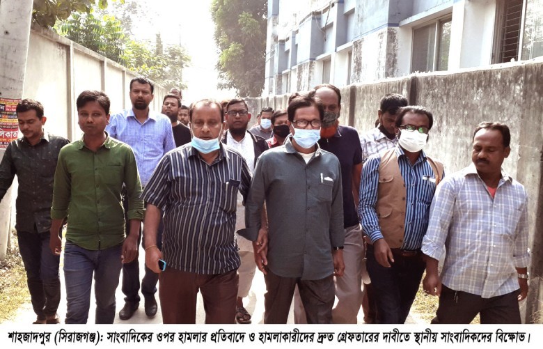 সিরাজগঞ্জের শাহজাদপুরে সাংবাদিকের ওপর সন্ত্রাসী হামলার প্রতিবাদে ও হামলাকারীদের দ্রæত গ্রেফতারের দাবীতে বিক্ষোভ মিছিল করেছে শাহজাদপুর কর্মরত সাংবাদিকবৃন্দ। বৃহস্পতিবার (২৫ নভেম্বর) দুপুরে এ বিক্ষোভ মিছিলটি শাহজাদপুুর প্রেস ক্লাব চত্বর থেকে বের হয়ে থানা চত্বরে গিয়ে শেষ হয়। বিক্ষোভ শেষে ভিকটিম মাইটিভি’র শাহজাদপুর প্রতিনিধি জাকারিয়া মাহমুদ বাদী হয়ে রাইয়ান লোদী, আব্দুল মজিদের নাম উল্লেখ করে অজ্ঞাতানামা আরও ৫/৬ জনের বিরুদ্ধে একটি লিখিত অভিযোগ দায়ের করেছেন।