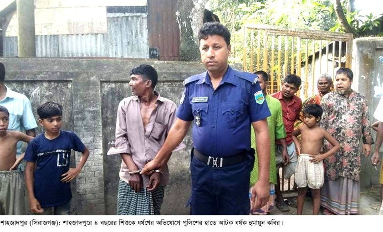 সিরাজগঞ্জের শাহজাদপুরে ৪ বছরের শিশুকে ভাত খাওয়ানোর কথা বলে বাসা থেকে ডেকে নিয়ে ধর্ষণের অভিযোগে হুমায়ুন কবির (৪৫) নামের এক রিক্সা চালককে আটক করেছে শাহজাদপুর থানা পুলিশ। সোমবার (১৬ মে) বিকেলে অভিযুক্ত হুমায়ুন কবিরকে জনগণ আটক করে পুলিশকে খবর দিলে শাহজাদপুর থানার এসআই কাঞ্চন কুমার তাকে থানা হেফাজতে নিয়ে আসেন। ভুক্তভোগী শিশু (৪) শাহজাদপুর উপজেলার কৈজুরি ইউনিয়নের গোপালপুর গ্রামের সিএনজি চালক জাহাঙ্গীরের মেয়ে। তারা শাহজাদপুর পৌর এলাকার খঞ্জনদিয়ার মহল্লার মন্টুর বাড়িতে ভাড়া থাকতো। এদিকে অভিযুক্ত হুমায়ুন কবির (৪৫) পাশেই ভাড়া বাড়িতে থাকতো । সে পাবনা জেলার চাটমোহর উপজেলার সন্দভার মোঃ গাজিউর রহমানের ছেলে বলে জানা গেছে ।
