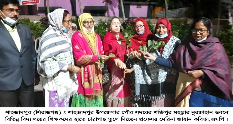 মুজিববর্ষ উপলক্ষে ২১২ টি শিক্ষা প্রতিষ্ঠানে ৫ হাজার চারা গাছ বিতরণ কার্যক্রম উদ্বোধন করেছেন সিরাজগঞ্জ-৬ আসনের এমপি ও কেন্দ্রীয় আওয়ামী লীগের কার্য নির্বাহী কমিটির অন্যতম সদস্য প্রফেসর মেরিনা জাহান কবিতা। শনিবার (২৫ ডিসেম্বর) দুপুরে সিরাজগঞ্জের শাহজাদপুর উপজেলার পৌর সদরের শক্তিপুর মহল্লার নূরজাহান ভবনে বিভিন্ন বিদ্যালয়ের শিক্ষকদের হাতে এ চারাগাছ তুলে দেন তিনি।এ বৃক্ষ বিতরণ কর্মসূচি উদ্বোধনের সময় উপস্থিত ছিলেন উপজেলা আওয়ামী লীগের সহ সভাপতি আব্দুল জব্বার, মনিরুল গনি চৌধুরী শুভ্র, শফিকুজ্জামানসহ বিভিন্ন বিদ্যালয়ের শিক্ষক মণ্ডলী।