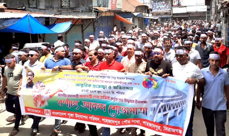 বাঙ্গালী জাতির অহংকার, বাঙালির গর্ব, স্বপ্নের পদ্মা সেতু উদ্বোধন উপলক্ষ্যে বঙ্গবন্ধু কন্যা প্রধানমন্ত্রী শেখ হাসিনা’কে শুভেচ্ছা ও অভিনন্দন জানিয়ে শাহজাদপুরে বিশাল বর্ণাঢ্য আনন্দ শোভাযাত্রা বের হয়। বাংলাদেশ পূজা উদযাপন পরিষদ শাহজাদপুর পৌর শাখা এ আনন্দ শোভাযাত্রার আয়োজন করে।