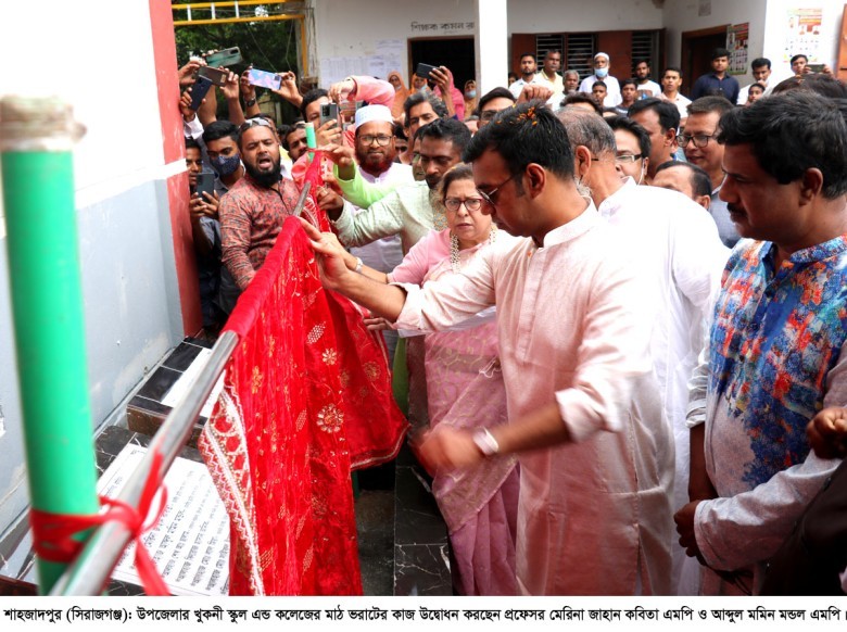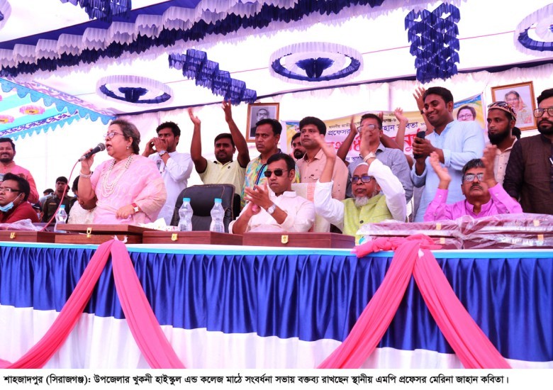 সিরাজগঞ্জের শাহজাদপুর উপজেলার খুকনী বহুমূখী উচ্চ বিদ্যালয় এন্ড কলেজ মাঠে শাহজাদপুরের গণমানুষের নেতা প্রফেসর মেরিনা জাহান কবিতা এমপিকে এনায়েতপুর থানা ইয়ূথ ফোরাম বিশেষ সংবর্ধনা প্রদান করেছে । উপজেলার খুকনী বহুমূখী উচ্চ বিদ্যালয় এন্ড কলেজের ম্যানেজিং কমিটির সভাপতি আলহাজ্ব ফিরোজ হাসান অনিকের সভাপতিত্বে ও এনায়েতপুর থানা ইয়ূথ ফোরামের সহ-সভাপতি মোঃ ওয়াহিদুজ্জামানের সঞ্চালনায় অনুষ্ঠিত ওই সংবর্ধনা সভায় প্রধান অতিথি হিসেবে বক্তব্য রাখেন সিরাজগঞ্জ-৫ আসনের এমপি আলহাজ্ব আব্দুল মমিম মন্ডল। এতে বিশেষ অতিথি হিসেবে বক্তব্য রাখেন, শাহজাদপুর উপজেলা আ.লীগের যুগ্ম-সাধারন সম্পাদক ও সাবেক ভাইস চেয়ারম্যান মুস্তাক আহমেদ, জনকণ্ঠ গ্রুপের সিনিয়র নির্বাহী পরিচালক ও এনায়েতপুর থানা ইয়ূথ ফোরামের উপদেষ্টা মোঃ নজরুল ইসলাম, কেন্দ্রীয় আ.লীগের আন্তর্জাতিক বিষয়ক উপ-কমিটির সদস্য সুমগ্ন করিম, ইউএনও শাহ মো. শামসুজ্জোহা, টেক্সজেন গ্রুপের এমডি আলহাজ্ব শেখ আব্দুছ সালাম, অরবিড এ্যাপারেলস লিঃ এর এমডি মোঃ আলীম আল রাজি প্রমূখ। সংবর্ধনা সভায় মূখ্য আলোচক হিসেবে আলোচনা করেন এনায়েতপুর থানা ইয়ূথ ফোরামের সভাপতি মোঃ জাকারিয়া তৌহিদ তমাল। এসময় অন্যান্যের মধ্যে বক্তব্য রাখেন, কেন্দ্রীয় যুবলীগের সদস্য আসাদুল্লাহ তুষার, এনায়েতপুর থানা আ.লীগ সেক্রেটারি আজগর আলী বিএসসি, সাবেক সেক্রেটার রাশেদুল ইসলাম সিরাজ, জেলা পরিষদ সদস্য শাহজাহান আলী মিয়া, ইউপি চেয়ারম্যান মুল্লুক চাঁদ, উপজেলা স্বেচ্ছাসেবক লীগ সভাপতি মাহবুবে ওয়াহেদ শেখ কাজল, প্রধান শিক্ষক আবদুস সালাম, অধ্যক্ষ মোঃ হাফিজুর রহমান বিএসসি, ছাত্র ফাইয়াজ ফারদীন প্রমূখ। বক্তারা শাহজাদপুর এনায়েতপুর সড়কের উন্নয়ন, তাঁতসমৃদ্ধ এ অঞ্চলের রং সুতার দাম কমানো, খুকনী বহুমূখী উচ্চ বিদ্যালয় এন্ড কলেজ সংলগ্ন ইউপি পরিষদ সড়কের সংস্কার ও মাঠ ভরাটের দাবী জানালে সংবর্ধিত নেতা স্থানীয় এমপি প্রফেসর মেরিনা জাহান কবিতা তা পর্যায়ক্রমে বাস্তবায়নের আশ্বাস দিয়ে খুকনী এলাকাকে আওয়ামী লীগের ঘাঁটিতে পরিণত করার আহবান জানান। এর আগে সংবর্ধিত নেতা প্রফেসর মেরিনা জাহান কবিতা এমপি ও আব্দুল মমিম মন্ডল এমপি ওই স্কুল এন্ড কলেজের মাঠ ভরাটের কাজের উদ্বোধন করেন।