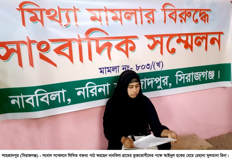 উক্ত সংবাদ সম্মেলনে নাববিলা গ্রামের ভুক্তভোগীদের পক্ষে আইনুল হকের মেয়ে রেহানা সুলতানা রিনা লিখিত বক্তব্যে অভিযোগ করেন, ‘গত ২৬ ডিসেম্বর শাহজাদপুরের নরিনা ইউপি নির্বাচনে মেম্বার প্রার্থী আলাউদ্দিন হেরে গেলে গ্রামবাসীর ওপর এর দোষ চাপান। এতেও ক্ষান্ত না হয়ে পরদিন ২৭ ডিসেম্বর রাতে আলাউদ্দিনের নেতৃত্বে কাদের, ছোরহাব, আলিম, আলমসহ ২০/২৫ জন সন্ত্রাসী কায়দায় লাঠি, ফালা, রামদাসহ দেশীয় অস্ত্রসস্ত্রে সজ্জিত হয়ে নাবাবিলা গ্রামের ঘুমন্ত গ্রামবাসীর বাড়িঘরে হামলা চালিয়ে বরাত আলী, আজিজুল হক, আবু বক্কার, আব্দুল ওহাব, আব্দুর রাজ্জাকসহ বেশ কয়েকজনের বাড়িঘর ভাংচুর করে। নিরীহ গ্রামবাসী পরিস্থিতি বেগতিক দেখে ৯৯৯ ফোন করলে ঘটনাস্থলে পুলিশ গিয়ে পরিস্থিতি নিয়ন্ত্রণে আনে। পরদিন, আলাউদ্দিন বাহিনীর আব্দুল কাদের ঘটনাটি মিমাংসার জন্য নাববিলা হাফিজিয়া মাদরাসা, ঈদগাহ মাঠ ও কবরস্থান কমিটির সভাপতি আলহাজ্ব আব্দুস সামাদের দ্বারস্থ হলে ৩০ ডিসেম্বর নাববিলা সরকারি প্রাথমিক বিদ্যালয়ে সমঝোতা বৈঠকের সিদ্ধান্ত গৃহিত হয়। কিন্তু ৩০ ডিসেম্বর আলাউদ্দিন গং সমঝোতা বৈঠকে উপস্থিত না হয়ে নিরীহ গ্রামবাসীকে ফাসাতে পরদিন ৩১ ডিসেম্বর ধুর্ত আলাউদ্দিন বাদী হয়ে চাদা দাবীসহ বিভিন্ন অভিযোগে ৪৫ জন নিরীহ গ্রামবাসীর নাম উল্লেখ করে আদালতে দ্রুত বিচার আইনে মামলা দায়ের করেন। মামলা দায়েরের পরও আলাউদ্দিন ও তার সন্ত্রাসী বাহিনী নিরীহদের গ্রামছাড়া করতে নানাভাবে ভয়ভীতি হুমকি ধামকি দিয়ে যাচ্ছেন।’