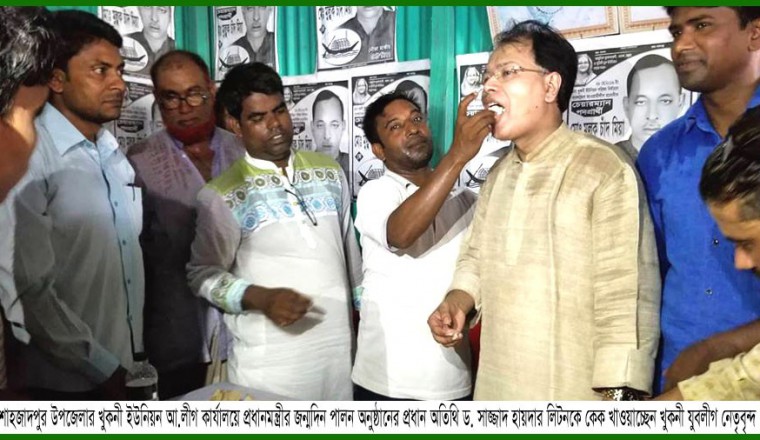 শাহজাদপুর সংবাদ ডটকম, নিজস্ব প্রতিবেদক, শুক্রবার, ২৮ সেপ্টেম্বর -২০১৮ খ্রিষ্টাব্দ : ‘জাতিরজনক বঙ্গবন্ধু শেখ মুজিবুর রহমানের কণ্যা, সফল রাষ্ট্রনায়ক, দেশরত্ন শেখ হাসিনা’কে আবারও রাষ্ট্র ক্ষমতায় বসাতে হবে। দেশে চলমান বহুমূখী উন্নয়নের ধারাকে আরও বেগবান, গতিশীল করতে আবারও নৌকা প্রতীকে ভোট দিতে হবে। জননেত্রী শেখ হাসিনা’র জন্মদিনের এ শুভলগ্নে সবাই আবারও নৌকা প্রতীকে ভোট দেয়ার শপথ নেই। দেশের উন্নয়নের বৃহৎ স্বার্থে জননেত্রী শেখ হাসিনা শাহজাদপুর আসন থেকে যাকেই নৌকা প্রতীকে দলীয় মনোনয়ন দেবেন, আমরা ঐক্যবদ্ধভাবে কাজ করে তাকে জয়ী করে এ আসনটি আবারও প্রধানমন্ত্রীকে উপহার দিতে চাই।’ আজ (শুক্রবার) দুপুরে শাহজাদপুর উপজেলার খুকনী ইউনিয়ন দলীয় কার্যালয়ে খুকনী ইউনিয়ন যুবলীগ আয়োজিত প্রধানমন্ত্রীর জন্মদিন পালন ও দোয়া মাহফিলের প্রধান অতিথি, বাংলাদেশ আওয়ামী যুবলীগ কেন্দ্রীয় কমিটির আন্তর্জাতিক বিষয়ক সম্পাদক, আসন্ন একাদশ জাতীয় সংসদ নির্বাচনে শাহজাদপুর থেকে নৌকা প্রতীকে দলীয় মনোনয়ন প্রত্যাশী ড. সাজ্জাদ হায়দার লিটন প্রধান অতিথির বক্তব্যে উপরোক্ত কথাগুলো বলেছেন। খুকনী ইউনিয়ন যুবলীগ সভাপতি আলমাছ হোসেনের সভাপতিত্বে ও খুকনী ইউনিয়ন যুবলীগের প্রচার ও প্রকাশনা বিষয়ক সম্পাদক হাবিবুর রহমান হাফিজের পরিচালনায় অনুষ্ঠিত প্রধানমন্ত্রীর জন্মদিন পালন ও দোয়া মাহফিল অনুষ্ঠানে বিশেষ অতিথি হিসেবে বক্তব্য রাখেন, খুকনী ইউনিয়ন যুবলীগের সাধারণ সম্পাদক আবু হেনা ভূঁইয়া, জালালপুর ইউনিয়ন যুবলীগ সভাপতি আরমান হোসেন, উপজেলা যুবলীগের অন্যতম সদস্য রাশেদুল হায়দার রাশেদ, পোতাজিয়া ইউনিয়ন যুবলীগ সভাপতি আইয়ুব আলী, খুকনী ইউনিয়ন যুবলীগের সাংস্কৃতিক বিষয়ক সম্পাদক জহুরুল ইসলাম প্রমূখ। বক্তব্যে বক্তারা বলেন, ‘আসন্ন একাদশ জাতীয় সংসদ নির্বাচনে জননেত্রী শেখ হাসিনা শাহজাদপুর আসনে যাকেই নৌকা প্রতীকে মনোনয়ন দেবেন, ঐক্যবদ্ধভাবে তাকেই বিজয়ী করতে সবাই কাজ করবো।’ প্রধানমন্ত্রী জননেত্রী শেখ হাসিনা’র জন্মদিন পালন উপলক্ষে অনুষ্ঠিত উক্ত অনুষ্ঠানের প্রধান অতিথি ড. সাজ্জাদ হায়দার লিটন দলীয় নেতাকর্মীদের সাথে নিয়ে কেক কাটেন এবং প্রধানমন্ত্রীর দীর্ঘায়ু কামনায় বিশেষ দোয়া মাহফিলে অংশ নেন। পরে প্রধান অতিথি স্থানীয় এলাকাবাসীর মধ্যে নৌকা প্রতীকে ভোট দেয়ার জন্য প্রচারপত্র বিলি করেন। ওই কেককাটা ও দোয়া মাহফিলে স্থানীয় নেতাকর্মীসহ সমর্থকেরা উপস্থিত ছিলেন।
