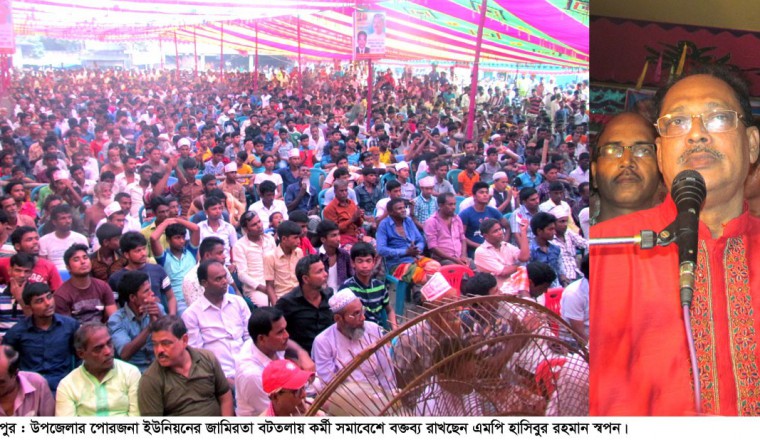 শামছুর রহমান শিশির, শাহজাদপুর থেকে : ‘প্রধানমন্ত্রী দেশরত্ন শেখ হাসিনা দেশ ও গণমানুষের কল্যাণে যেসকল উন্নয়ন করে চলেছেন তা প্রান্তিক পর্যায়ের জনগণের মধ্যে সঠিকভাবে তুলে ধরলে নৌকা প্রতীকের বিজয়ে খুব বেশী বেগ পেতে হবে না। আগামী জাতীয় সংসদ নির্বাচনে সারাদেশে যাই হোক না কেনো শাহজাদপুরের এ আসনে নৌকা প্রতীকের প্রার্থীকে বিজয়ী করে প্রধানমন্ত্রী শেখ হাসিনাকে উপহার দেয়া হবে। পোরজনা ইউনিয়ন আওয়ামী লীগের উদ্যোগে ইতিপূর্বে এত বড় সভা অনুষ্ঠিত হয়নি। এতে পোরজনা ইউনিয়ন আওয়ামী লীগ সাংগঠনিক ভাবে অতীতের তুলনায় বহুগুণে শক্তিশালী হয়েছে-এটা প্রমাণ হয়েছে। ইতিমধ্যেই রবীন্দ্র বিশ্ববিদ্যালয়ের ভিসি ও রেজিষ্টার নিয়োগ দেয়া হয়েছে। গালা-কৈটলা-থানারঘাট করতোয়া সেতু পর্যন্ত বিদেশী দাতা সংস্থার অর্থায়নে পানি উন্নয়ন বোর্ডের (পাউবো) মাধ্যমে ১ হাজার কোটি টাকা প্রকল্প ব্যায়ে বাঁধ ও স্লুইচ গেট নির্মাণের জন্য টেন্ডার হয়েছে। অচিরেই কাজ শুরু হবে। ওই প্রকল্প কাজ সম্পন্ন হলে উপজেলার বন্যাকবলিত গালা, সোনাতুনী, পোরজনা জালালপুর, খুকনী-পূর্বাঞ্চলের এই ৫ ইউনিয়নবাসীসহ পুরো শাহজাদপুরের লাখ লাখ কৃষক সারা বছরেই এক ফসলের পরিবর্তে বহু ফসলের আবাদ করার মাধ্যমে তাদের ভাগ্যোন্নয়নে ব্যাপক পরিবর্তন সাধন করতে পারবেন। প্রধানমন্ত্রী সারাদেশের ১’শ ১৭ টি উপজেলায় ২০১৭ সালের মধ্যে শতভাগ বিদ্যুতের আওতায় আনার যে ঘোষণা দিয়েছিলেন তন্মদ্ধে শাহজাদপুরও রয়েছে। এ বছর শেষ হবার আগেই শাহজাদপুর উপজেলাকে শতভাগ বিদুতায়ন উপজেলা ঘোষণা করা হবে।’ আজ সোমবার সন্ধ্যায় শাহজাদপুর উপজেলার পোরজনা ইউনিয়নের জামিরতা বটতলায় পোরজনা ইউনিয়ন আওয়ামী লীগ আয়োজিত বিশাল এক কর্মীসভায় প্রধান অতিথির বক্তব্যে উপরোক্ত কথাগুলো বলেন স্থানীয় এমপি আলহাজ্বা হাসিবুর রহমান স্বপন। পোরজনা ইউনিয়ন আওয়ামী লীগের সভাপতি মোক্তার হোসেনের সভাপতিত্বে ও সাধারন সম্পাদক অনিল ঘোষের পরিচালনায় অনুষ্ঠিত ওই কর্মীসভায় বিশেষ অতিথি ছিলেন, উপজেলা পরিষদ চেয়ারম্যান প্রফেসর আজাদ রহমান, ভাইস চেয়ারম্যান মুস্তাক আহমেদ, পৌরমেয়র (ভার:) নাসির উদ্দিন, জেলা আ’লীগ নেতা এড. আব্দুল হাই, উপজেলা আ’লীগ নেতা গোলাম মওলা আজম, আমিনুল ইসলাম ভুলু, শামছুল ইসলাম, কোরবান আলী, রফিকুল ইসলাম বাবলা, পৌর আ’লীগের সাধারণ সম্পাদক আমিরুল ইসলাম শাহু, ইউপি চেয়ারম্যান সাইফুল ইসলাম, ইউপি চেয়ারম্যান হাসিবুল হক হাসান, ইউপি চেয়ারম্যান জাহিদুল ইসলাম মুকুল, ফারুক সরকার, যুবলীগ নেতা আশিকুল হক দিনার, ছাত্রলীগের সাধারন সম্পাদক ইসলাম শেখ প্রমূখ। হাজার হাজার দলীয় নেতাকর্মী ও সমর্থকদের সমাগমে ওই কর্মীসভা বিশাল জনসভায় রূপ নেয়। শেষে এমপি জাম