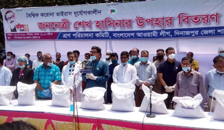 নৌপরিবহন প্রতিমন্ত্রী খালিদ মাহমুদ চৌধুরী বলেছেন, যতদিন প্রধানমন্ত্রী শেখ হাসিনা ক্ষমতায় থাকবেন ততদিন পথ হারাবে না বাংলাদেশ। করোনা মোকাবেলায় বর্তমান সরকার সবাইকে সঙ্গে নিয়ে ঐক্যবদ্ধভাবে কাজ করছে। আমরা সকলেই সরকারের সঙ্গে ঐক্যবদ্ধ। এভাবে সকলে ঐক্যবদ্ধ থাকলে অচিরেই বাংলাদেশ করোনা মোকাবেলায় সক্ষম হবে। প্রধানমন্ত্রী শেখ হাসিনার নির্দেশে আওয়ামী লীগ ত্রাণ কার্যক্রম পরিচালনা করে যাচ্ছে। শুধু আওয়ামী লীগ নয় জনপ্রতিনিধিরাও ত্রাণ বিতরণ করে যাচ্ছেন। শনিবার (৯ মে) বেলা সাড়ে ১১টার দিকে দিনাজপুর গোর-এ শহীদ বড় ময়দানে জেলা আওয়ামী লীগের আয়োজনে অসহায়দের মাঝে ত্রাণ বিতরণ অনুষ্ঠানে প্রধান অতিথির বক্তব্যে তিনি এসব কথা বলেন। বিএনপি মহাসচিব মির্জা ফখরুল ইসলাম আলমগীরকে উদ্দেশ করে খালিদ মাহমুদ চৌধুরী বলেন, যদি আপনার প্রয়োজন লাগে আপনি আবেদন করলে বিশেষ ওএমএসের চাল পাবেন। আপনি প্রতিদিন মিডিয়ার সামনে বলছেন বর্তমান সরকার ত্রাণ পরিচালনা করতে পারছে না। অথচ প্রধানমন্ত্রী শেখ হাসিনার আহ্বানে সাড়া দিয়ে সমাজের বিত্তশালীরাও এগিয়ে এসেছেন। তিনি আরও বলেন, বর্তমানে দেশের মাঠে মাঠে কৃষকের ধান কাটার উৎসব চলছে। অথচ বিএনপি সরকারের আমলে এই উত্তরাঞ্চলে অসংখ্য কৃষককে গুলি করে মেরে ফেলা হয়েছে। বিশ্বজুড়ে মহামারি আকার ধারণ করা করোনাভাইরাসের মধ্যেও বাংলাদেশের কৃষকরা অনেক ভালো আছেন। তারা ধান কেটে ঘরে তুলছেন। দিনাজপুর জেলা আওয়ামী লীগের সাধারণ সম্পাদক ও জেলা পরিষদের চেয়ারম্যান আজিজুল ইমাম চৌধুরীর সভাপতিত্বে অনুষ্ঠানে অন্যান্যের মধ্যে দিনাজপুর-১ আসনের এমপি মনোরঞ্জন শীল গোপাল, সংরক্ষিত আসনের এমপি জাকিয়া তাবাসসুম জুই, জেলা প্রশাসক মো. মাহামুদুল আলম, পুলিশ সুপার আনোয়ার হোসেন, আওয়ামী লীগের ত্রাণ পরিচালনা কমিটির আহ্বায়ক আলতাফুজ্জামান মিতা, সদস্য সচিব ফারুকুজ্জামান চৌধুরী মাইকেল প্রমুখ উপস্থিত ছিলেন।