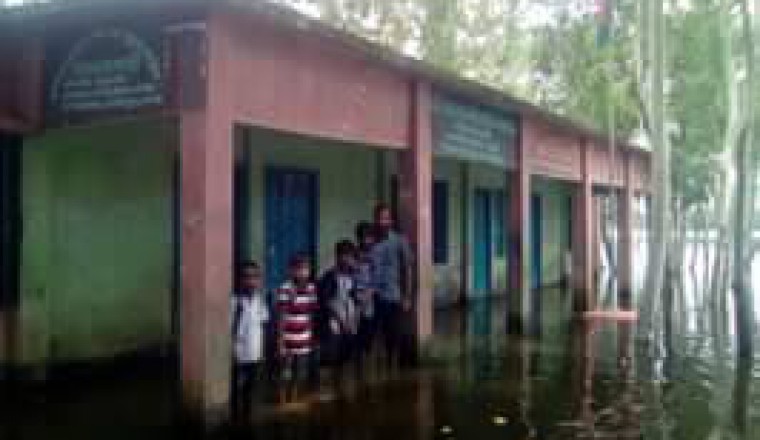 আল-আমিন: সিরাজগঞ্জ উল্লাপাড়া উপজেলার দূর্গানগর ইউনিয়নে ৩ নং ওয়ার্ডের চরভাটবেরা প্রাথমিক বিদ্যালয়টির বেহাল দশা বিগত কয়েক বছর ধরে। বর্ষাকালের শুরু থেকেই টানা চার মাস ধরে চরভাটবেরা গ্রামের শিশুদের স্কুলে যাতায়াতের একমাত্র উপায় নৌকা। বাড়িসহ চারপাশ পানিতে ভরপুর, স্কুলও থাকে প্লাবিত। কিন্তু চার মাস স্কুল বন্ধ রাখা সম্ভব না তাই শিশুরা এ সময়টাতে দলবেঁধে নৌকায় করে স্কুলে যাওয়া-আসা করে। একইভাবে যাতায়াত করেন শিক্ষকরাও। নদীতে পূর্ণ জোয়ার থাকায় বর্ষার পানি নামতে না পেরে আটকে থাকায় মে শুরু থেকে সেপ্টেম্বর পর্যন্ত এভাবেই চলে স্কুলে যাতায়াত। ফলে প্রতিবছরই বর্ষাকাল শুরুর সাথে সাথে এখানকার আশপাশের কয়েকটি স্কুলের গ্রামের কয়েকশত বাবা-মায়ের উৎকণ্ঠার শুরু হয়। এ উৎকণ্ঠা থাকে পুরো বর্ষা মৌসুম। গ্রামের শিশুরা এভাবেই গত ১২ বছর ধরে বছরের চার মাস নৌকায় করে স্কুলে আসা-যাওয়া করছে। এ নিয়ে এলাকাবাসীর অভিযোগ থাকলেও অবস্থার পরিবর্তন হয়নি এক যুগেও। ভারি বর্ষণ ও জোয়ারের পানিতে স্থায়ী জলাবদ্ধতার কারণে উপজেলার বিলাঞ্চল দূর্গানগর ইউনিয়নের রাউতান, নুন্দীবেরা, চরভাটবের, ভাটবেরা গ্রামের মানুষ বর্ষা মৌসুমে চার় মাস আবদ্ধ অবস্থায় বসবাস করেন। ফলে পানিবন্দি এ গ্রামসহ আশপাশের গ্রামের শিশুরা গ্রামের পশ্চিম প্রান্তে অবস্থিত ৩০ নাং চরভাটবেরা সরকারি প্রাথমিক বিদ্যালয়ে যাতায়াত করে নৌকায়। স্কুলে পাঠদান গ্রহণের জন্য জীবনের ঝুঁকি নিয়েই নৌকা চালিয়ে আসে কোমলমতি এসব শিশু। তবে স্কুলের কাছাকাছি থাকা অনেকেই হাঁটু বা কোমর পানি ভেঙে আসে স্কুলে। যাতায়াত কষ্টের কোনো প্রভাব নেই পানিবন্দি এ স্কুলের শিশুদের মধ্যে। প্রতিদিন শিক্ষার্থীদের উপস্থিতি শতকরা ৯০ শতাংশ। তেমনি প্রাথমিক সমাপনী পরীক্ষাতেও শতভাগ পাশের অনন্য ধারা রক্ষা করে চলছে স্কুলটি। সরেজমিনে স্কুলে গিয়ে দেখা যায়, স্কুল শুরু সময়ের আগেই ছোট ছোট নৌকায় করে এসে হাজির শিশুরা। পায়ে হেঁটে আসার পথ নৌকায় ঝুঁকি নিয়ে এলেও তাদের মধ্যে হৈ-হুল্লোড় আর হাসি ঠাট্টার কোনো কমতি ছিল না। তবে স্কুলভবনটি ছাড়া আশপাশের মাঠঘাট, স্কুলের টয়লেট, টিউবয়েল সব তলিয়ে গেছে। স্কুলের একাধিক শিক্ষার্থীরা জানায়, বৃষ্টি হলে স্কুল ভবনের ছাদ চুইয়ে পানি পড়ে। খসে পড়ে ভবনের পলেস্তার ও দেখা দিয়েছে বিভিন্ন জায়গায় ফাটল । এ সময় জীবনের ঝুকি নিয়েও ক্লাস করে এবং ভোগান্তির শেষ থাকে না ছাত্র ছাত্রীদের । স্কুলের প্রধান শিক্ষক দেলোয়ার হোসেন ও সহকারী শিক্ষক ইউসুফ হোসেন জানালেন, স্কুলের বেশিরভাগ শিক্ষার্থী চরভাটবেরা গ্রামের। চলতি বছর স্কুলে ২৫০ জন শিক্ষার্থী রয়েছে। পানিবন্দি অবস্থায় স্কুল চালু রাখায় শিশুদের