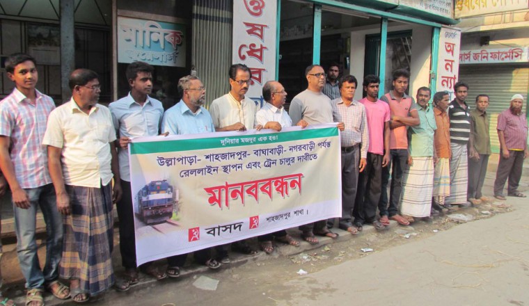 শামছুর রহমান শিশির ও ফারুক হাসান কাহার: উল্লাপাড়া স্টেশন থেকে শাহজাদপুর বাঘাবাড়ী- নগরবাড়ীর ঢালার চর পর্যন্ত রেললাইন স্থাপন এবং টেন চালুর দাবিতে গতকাল শনিবার বিকেলে বাংলাদেশের সমাজতান্ত্রিক দল বাসদের উদ্যোগে পৌর এলাকার মনিরামপুর বাজারের প্রধান সড়কে এক মানববন্ধন কর্মসূচি পালিত হয়। উক্ত মানববন্ধনে বিভিন্ন শ্রেণি পেশার মানুষ অংশ গ্রহন করে। প্রায় ঘন্টা ব্যাপি মানব বন্ধন চলাকালে বক্তব্য রাখেন উপজেলা বাসদের আহবায়ক কমরেড এ্যাডভোকেট আনোয়ার হোসেন, কমরেড কবীর আজমল বিপুল, এ,আর সিদ্দিকী, আতাউর রহমান পিন্টু, সাগর বসাক, গণফ্রন্ট নেতা কাজী শওকত, কমরেড মোক্তার হোসেন, আব্দুল্লাহ, আব্দুল আলিম, ছানোয়ার হোসেন, মোজাম্মেল হক, আব্দুল কুদ্দুস প্রমুখ। মানব বন্ধন কর্মসূচিতে বাসদের আহবায়ক এ্যাডভোকেট আনোয়ার হোসেন বলেন রেললাইন স্থাপনের দাবি আমাদের নিজের জন্য নয় এ দাবি শাহজাদপুরবাসীর আমরা ইতি পূর্বে রবীন্দ্র বিশ্ব বিদ্যালয়ের ব্যাপারে সর্ব প্রথম আমরা রাজপথে মানব বন্ধন সহ নানা আন্দোলনে অংশগ্রহণ করি। সেই কারণে আজ শাহজাদপুরে রবীন্দ্র বিশ্ব বিদ্যালয় ভিত্তি প্রস্তর স্থাপন হয়েছে। তাই বাংলাদেশের মধ্যে শাহজাদপুর উপজেলা অন্যান্য উপজেলার চেয়ে অনেক গুরুত্বপূর্ণ। তাই সরকারের কাছে জোর দাবি, জনগণের কথা চিন্তা ও সহজ যাতায়াতের কথা ভেবে অবিলম্বে উল্লাপাড়া হতে গো সম্পদ ও তাতঁ সমৃদ্ধ এলাকা বলে খ্যাত শাহজাদপুর বাঘাবাড়ী এবং নগরবাড়ীর ঢালার চর পর্যন্ত রেললাইন স্থাপন করলে এ এলাকার মানুষ অনেক উপকৃত হবে।