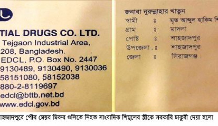 শামছুর রহমান শিশির : গত শনিবার রাতে দৈনিক সমকালের শাহজাদপুর প্রতিনিধি আব্দুল হাকিম শিমুলের বাসভবনে শোকসন্তপ্ত পরিবারের প্রতি সমবেদনা জানাতে গিয়েছিলেন স্বাস্থ্যমন্ত্রী মোহাম্মদ নাসিম। এ সময় এমপি হাসিবুর রহমান স্বপনসহ গণমাধ্যমকর্মীদের উপস্থিতিতে তিনি দ্রুত নিহত সাংবাদিক শিমুলের স্ত্রী নুরুন্নাহার খাতুনকে স্বাস্থ্য বিভাগে চাকুরী দেয়ার আশ্বাস দিয়েছিলেন। তার দেয়া সেই আশ্বাস তিনি রাখলেন। আজ বুধবার বিকেলে ঢাকার তেজগাঁও বাণিজ্যিক এলাকাস্থ রাষ্ট্রায়ত্ব এসেন্সিয়াল ড্রাগ কোম্পানী লিঃ এর কেন্দ্রীয় কার্যালয়ে ওই কোম্পানীর পক্ষ থেকে নিহত সাংবাদিকের স্ত্রী নুরুন্নাহার খাতুনের সরকারি চাকুরীর নিয়োগপত্র স্থানীয় এমপি আলহাজ্ব হাসিবুর রহমান স্বপনের হাতে হস্তান্তর করা হয়। এ ব্যাপারে স্থানীয় এমপি আলহাজ্ব হাসিবুর রহমান স্বপনের সাথে যোগাযোগ করা হলে তিনি সাংবাদিকদের জানান, ‘ স্বাস্থ্যমন্ত্রী মোহাম্মদ নাসিম কথা দিয়েছিলেন নিহত সাংবাদিক আব্দুল হাকিমের স্ত্রীকে স্বাস্থ্য বিভাগের অধীনে একটি সরকারি চাকুরী দেয়ার। তার কথা তিনি রেখেছেন। স্বাস্থ্য বিভাগের অধীনস্থ ও রাষ্ট্রায়ত্ব এসেন্সিয়াল ড্রাগ কোম্পানী লিমিটেড-এ নিহতের স্ত্রী নুরুন্নাহারের নিয়োগপত্র হাতে পেয়েছি। শুক্রবার সকালে নিহতের স্ত্রী নুরুন্নাহারের হাতে আমি নিজে ওই নিয়োগপত্র পৌছে দেবো।’ এদিকে, শাহজাদপুর পৌর মেয়র হালিমুল হক মিরুর শর্টগানের গুলিতে নিহত সাংবাদিক শিমুলের স্ত্রীকে সরকারি চাকুরী দেয়ায় শাহজাদপুরে কর্মরত সাংবাদিকবৃন্দসহ বিভিন্ন শ্রেণিপেশার মানুষ স্বাস্থ্যমন্ত্রী মোহাম্মদ নাসিম ও স্থানীয় এমপি আলহাজ্ব হাসিবুর রহমান স্বপনের প্রতি কৃতজ্ঞতা প্রকাশ করেছেন।