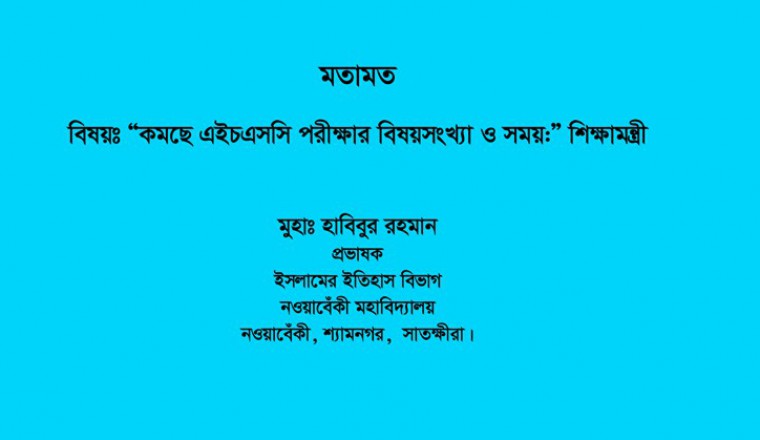 মতামতজনাব সম্পাদক, সালাম ও শুভেচ্ছা জানবেন। জুন 28-20 তারিখে আপনার পত্রিকার রিপোর্ট “কমছে এইচএসসি পরীক্ষার বিষয়সংখ্যা ও সময়:” শিক্ষামন্ত্রী বিষয়ে মতামত প্রদান করছি, সম্ভব হলে মতামতটি আপনার পত্রিকায় প্রকাশ করার বিনিত অনুরোধ করছি। এবারের এইচএসসি পরীক্ষাটি করোনার কারনে অনুষ্ঠিত করা না যায় বা সীমিত আকারে গ্রহন করার প্রশ্ন আসে তাহলে সরকার একটা কাজ করতে পারে, তা হলো পরীক্ষা একবারে না নিয়ে এখনই ঘোষনা দেওয়া যায় যে, পরীক্ষা নেওয়া হবেনা তোমরা যারা পরীক্ষার্থী আছো তোমাদের বিগত এসএসসি পরীক্ষার রেজাল্ট বহাল করে দেওয়া হবে। তোমরা বরং এখনই বিশ্ববিদ্যালয়ে ভর্তির জন্য প্রস্তুতি গ্রহন শুরু করো। বিষয়টি যদি এভাবে ভাবা হয় তাহলে করোনার মধ্যে হতাশাগ্রস্ত লক্ষ লক্ষ পরীক্ষার্থী চিন্তামুক্ত হয়ে পরবর্তী পদক্ষেপ গ্রহন করতে পারবে। এব্যাপারে আপনার মতামত সম্পাদকীয় কলামে আমার প্রস্তাবনার আলোকে লিখলে ভালো হবে বলে আমি মনে করছি। আপনার সুস্থতা কামনা করে শেষ করছি। মুহাঃ হাবিবুর রহমান প্রভাষক ইসলামের ইতিহাস বিভাগ নওয়াবেঁকী মহাবিদ্যালয় নওয়াবেঁকী, শ্যামনগর, সাতক্ষীরা।
