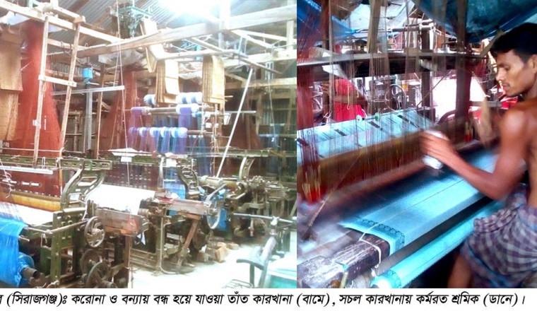 করোনা ও বন্যায় দেশের তাঁতশিল্পের কেন্দ্রবিন্দু সিরাজগঞ্জ জেলার শাহজাদপুর উপজেলার প্রায় লক্ষাধিক তাঁত মহাজন ও শ্রমিকেরা মানবেতর দিন কাটাচ্ছে। করোনা ও বন্যা ছাড়াও বৃষ্টিপাতজণিত কারণে পুঁজি সংকটে কারখানায় তাঁতবস্ত্র উৎপাদন বন্ধ, তাঁতবস্ত্র উৎপাদনের সকল কাঁচামাল ও উপকরণের মূল্যবৃদ্ধি, চাল, ডালসহ নিত্যপ্রয়োজনীয় সকল দ্রব্যের মূল্যবৃদ্ধি এবং উত্তরাঞ্চলের সর্ববৃহৎ শাহজাদপুর কাপড়ের হাটে বেঁচাকেনায় চরম মন্দাভাব, বিভিন্ন এনজিও, সুদখেকো সুদ ব্যবসায়ী, সমিতি ও ব্যাংক থেকে নেওয়া ঋণের বোঝা বহন, ক্রয়-ক্ষমতা হ্রাস, তাঁতবস্ত্র উৎপাদনের নায্য মজুরি প্রাপ্তিতে বঞ্চিতসহ নানাবিধ কারণে শাহজাদপুর উপজেলার চির অবহেলিত, চির পতিত, চির অপাংক্তেয় প্রায় লক্ষাধিক তাঁত মহাজন ও শ্রমিকের বুক ফাঁটলেও মুখ ফোঁটেনা। এসব তাঁতী ও শমিকের বিচারের বাণী নিরবে নিভৃতে কাঁদছে। দেখার কেউ নেই। নেই পাশে কেউ। জানা গেছে, শাহজাদপুর উপজেলার পৌর এলাকাসহ ১৩টি ইউনিয়নে প্রায় দেড় লাখ তাঁত রয়েছে। তন্মদ্ধে প্রায় ১ লাখ পাওয়ারলুম ও প্রায় ৫০ হাজার হ্যান্ডলুম ও প্রায় ১ লাখ শ্রমিক রয়েছে। লকডাউন ঘোষিত সময়কালে শাহজাদপুরের সকল তাঁত কারখানা বন্ধ ছিলো। এ দীর্ঘ সময়ে এলাকার তাঁতীরা কোনরূপ তাঁতবস্ত্র উৎপাদন বা উৎপাদিত বস্ত্র হাট বাজারে বিক্রি করতে পারেনি। এ সময় বাধ্য হয়ে তাঁত মালিকেরা অনেকেই পুঁজি ভেঙ্গে ফেলেছেন আবার অনেকেই ঋণপানে জর্জরিত হয়েছেন। লকডাউন তুলে নেয়ার পর তাঁত মালিকেরা তাদের তাঁত কারখানা চালু করার অনুমতি পেলেও পরবর্তীতে পুঁজি না থাকায় তা চালু করা সম্ভব হয়নি। কেউ কেউ ধারদেনা করে তাঁত কারখানায় বস্ত্র উৎপাদনের চেষ্টা করলেও উৎপাদিত তাঁতবস্ত্র হাটে বিক্রি করতে না পেরে পুনরায় তাঁত বন্ধ করে দিতে বাধ্য হয়েছেন। গত কয়েক মাস ধরে বিরাজমান করোনা ভাইরাসের প্রভাবে তীব্র পুঁজি সংকটে পড়ে এলাকার প্রায় ৬০ ভাগ তাঁত বন্ধ করে দিতে বাধ্য হয়েছে তাঁতী মহাজন। বন্ধ হয়ে যাওয়া তাঁত কারখানার হাজার হাজার তাঁত শ্রমিক বেকার হয়ে পড়ায় পরিবার পরিজন নিয়ে তারা খেয়ে না খেয়ে দিন কাটাচ্ছে। তার পরেও ‘মরার ওপর খারার ঘা’ এর মতোই চলমান করোনা সংকটের সাথে ভয়াবহ বন্যায় এলাকার অসংখ্য তাঁত কারখানা বন্ধ হয়ে যাওয়ায় এসব কারখানার তাঁত শ্রমিকদের জীবনজীবীকার প্রশ্নে তারা চরম অনিশ্চয়তা, উদ্বেগ আর উৎকন্ঠায় দিন কাটাচ্ছেন। শাহজাদপুর পৌর এলাকার রূপপুর নতুনপাড়া মহল্লার রাকিব উইভিং ফ্যাক্টরির মালিক হাজী ওমর, আজাদ উইভিং ফ্যাক্টরির মালিক আজাদ জানান,‘লকডাউনের পর থেকে হাজী ওমরের তাঁত কারখানার মোট ১৪টি পাওয়ারলুম ও ৪টি হ্যান্ডলুম এবং তার ভাই আব্দুস সালামের তাঁত কারখানার মোট ১০