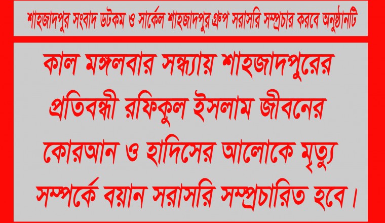 শামছুর রহমান শিশির : আগামীকাল মঙ্গলবার সন্ধ্যায় শাহজাদপুর পৌরসদরের রূপপুর মহল্লাস্থ রংধনু ডিজিটাল স্কুল ক্যাম্পাসে রংধনু কিন্ডার গার্টেন এন্ড মডেল হাইস্কুলের প্রতিষ্ঠাতা, বাংলাদেশ রাইফেলস্ ( বিডিআর) এর সুবেদার মেজর (অবঃ) বীর মুক্তিযোদ্ধা আলহাজ্ব হাফিজুর রহমানের প্রথম মৃত্যুবার্ষিকী উপলক্ষে বিটিভি ও বিটিভি ওয়ার্ল্ডের ভাষ্যকর, শাহজাদপুরের গর্বিত সন্তান প্রতিবন্ধী মো: রফিকুল ইসলাম জীবন (চিনাধুকুরিয়া ) কোরআন ও হাদিসের আলোকে ‘মৃত্যু’ সম্পর্কে বয়ান করবেন । উক্ত অনুষ্ঠানটি যৌথভাবে একযোগে ‘শাহজাদপুর সংবাদ ডটকম’ ও ‘সার্কেল শাহজাদপুর’ সরাসরি সম্প্রচার করবে। মরহুম বীর মুক্তিযোদ্ধা আলহাজ্ব হাফিজুর রহমানের আত্মার মাগফেরাত কামনায় তার জ্বৈষ্ঠ্য সন্তান রংধনু ডিজিটাল স্কুলের চেয়ারম্যান আলহাজ্ব রফিকুল ইসলাম স্বপন সকলের প্রতি উদাত্ত আহবান জানিয়েছেন এবং মানুষের মৃত্যু সম্পর্কে শাহজাদপুরের প্রতিবন্ধী বক্তার বক্তব্য সরাসরি শাহজাদপুর সংবাদ ডটকম ও সার্কেল শাহজাদপুরে দেখার আহবান জানিয়েছেন।