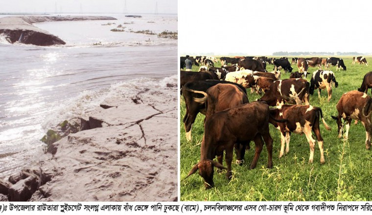 সিরাজগঞ্জের শাহজাদপুরের বাঘাবাড়ী থেকে তাড়াশের নিমাইচড়া পর্যন্ত ৫৪ কিলোমিটার দীর্ঘ চলনবিল বন্যা নিয়ন্ত্রণ বাঁধের শাহজাদপুর উপজেলার রাউতারা স্লুইস গেট সংলগ্ন এলাকার ১ হাজার ২৫০ মিটার রিং বাঁধটি অবশেষে বন্যার পানির প্রবল চাপে ভেঙ্গে গেছে। ফলে বৃহত্তর চলনবিলাঞ্চলের শাহজাদপুর, উল্লাপাড়া, রায়গঞ্জ, তাড়াশ, ভাঙ্গুড়া, ফরিদপুর, চাটমোহর, সিংড়া, গুরুদাসপুর, আত্রাই, রাণীনগর, শেরপুর ও নন্দীগ্রাম উপজেলার বিস্তৃর্ণ এলাকা বন্যার পানিতে প্লাবিত হয়েছে। এসব অঞ্চলের হাজার হাজার গো-খামারে (বাথান) লালন পালন করা প্রায় ৩ লক্ষাধিক গবাদীপশুকে নিরাপদ আশ্রয়ে নিতে খামারিদের অবর্ণনীয় দুর্ভোগ-দুর্গতি পোহাতে হচ্ছে। দেশের দুগ্ধশিল্পের কেন্দ্রবিন্দু শাহজাদপুরসহ চলনবিলাঞ্চলের খামারিরা তাদের গবাদীপশুকে নিরাপদ আশ্রয়ে নিয়ে যেতে দিশেহারা হয়ে পড়েছে। এসব এলাকায় রোপিত উন্নতজাতের গো-খাদ্য ( কাঁচা ঘাস) ইতিমধ্যেই আকষ্মিক বাঁধ ভাঙ্গা বন্যার পানিতে তলিয়ে যাওয়ায় এ অঞ্চলে গো-খাদ্য কাঁচা ঘাসের তীব্র সংকট সৃস্টি হয়েছে। গত মঙ্গলবার আকষ্মিক বন্যার পানিতে বড়াল নদী তীরবর্তী রাউতারা-নিমাইচড়া চলনবিল বন্যা নিয়ন্ত্রণ বাঁধের রাউতারা অংশে ভেঙ্গে গেল মুহুর্তেই এ অঞ্চলের বিস্তৃত গো-চারণ ভূমি বানের পানিতে তলিয়ে যায়। এসব স্থানে প্রতিপালন করা গবাদীপশু শ্যালো নৌকার মাধ্যমে পরিবহন করে নিরাপদ স্থানে নিয়ে যাচ্ছে খামারিরা। কাঁচা ঘাস বন্যার পানিতে তলিয়ে যাওয়ায় চলনবিল অঞ্চলে গো-খাদ্য ব্যবসায়ীরা গো-খাদ্য খড় নৌকাযোগে বিভিন্ন স্থানের খামারীদের সরবরাহ করছে। স্থানীয় গো-খামারিরা জানান, ‘হঠাৎ করেই রাউতারা স্লুইচগেট সংলগ্ন এলাকায় রাউতারা-নিমাইচড়া রিং বাঁধটি ভেঙ্গে যাওয়ায় বাঘাবাড়ী মিল্কশেড এরিয়াসহ চলনবিলাঞ্চলের প্রায় ৩ লক্ষাধিক গবাদীপশু নিয়ে গো-খামারীরা চরম উদ্বেগ আর উৎকন্ঠায় কালাতিপাত করছে। ইতিমধ্যেই এ অঞ্চলের গো-খামারিরা তাদের গবাদীপশুকে নিরাপদ সরিয়ে নিচ্ছে। প্রায় দেড় যুগ ধরে ফি বছরই ফসল রক্ষার নামে এই বালুর বাঁধ নির্মাণ করা হয়। প্রথম দিকে অস্থায়ীভাবে এ বাঁধ নিমার্ণ ব্যয় ৯৯ লাখ টাকা হলেও গত কয়েক বছর ধরে এ ব্যয় বেড়ে প্রায় দেড় কোটি টাকায় দাঁড়িয়েছে। এতে সরকারের কোটি কোটি টাকার হরিলুট হচ্ছে। স্থানীয়রা এ হরিলুটের সাথে সংশ্লিষ্টদের যোগসূত্র রয়েছে বলে অভিযোগ উত্থাপন করেছে। এ বিষয়ে সিরাজগঞ্জ পানি উন্নয়ন বোর্ডের নির্বাহী প্রকৌশলী শফিকুল ইসলাম স্থানীদের এ অভিযোগ অস্বীকার করে বলেন, এ কাজে কোন অনিয়ম-দুর্নীতি হয়নি। সিডিউল অনুযায়ী কাজ হয়েছে। শাহজাদপুরসহ চলনবিল অঞ্চলের ১৪ উপজেলার ফসল রক্ষার্থে গত ২০ বছর ধরে অস্থায়ী ভাব