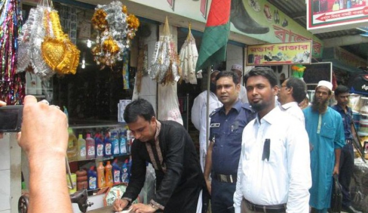 শাহজাদপুর সংবাদদাতাঃ আজ সোমবার সকালে সিরাজগঞ্জের শাহজাদপুরের নতুনমাটি ও মনিরামপুর বাজারের ১৯ দোকানদারকে ভ্রাম্যমান আদালতের ম্যাজিস্ট্রেট শাহজাদপুর উপজেলা নির্বাহী কর্মকর্তা শামীম আহমেদ জাতীয় পতাকা অবমাননাকর জনক ভাবে উত্তোলন করায় ৯ হাজার ৭০০ টাকা জরিমানা করেছেন। এ সময় তার সাথে উপস্থিত ছিলেন সহকারি কমিশনার (ভুমি) আরিফুজ্জামান ও শাহজাদপুর থানার ইন্সপেক্টর (তদন্ত) মনিরুল ইসলাম। তারা জানান, এরা সবাই জাতীয় শোক দিবসে সঠিক নিয়মে জাতীয় পতাকা উত্তোলন না করে অবমাননাকর জনক ভাবে উত্তোলন করে। তাই তাদের এ অর্থ দন্ড দেয়া হয়েছে।