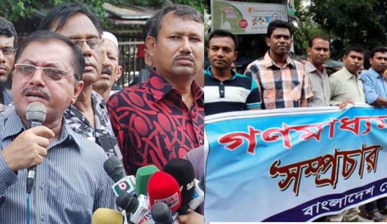 শাহজাদপুর সংবাদ ডটকম : জাতীয় সম্প্রচার নীতিমালাকে গণমাধ্যমের জন্য ‘কালো অধ্যায়’ আখ্যায়িত করে তা না মানার ঘোষণা দিয়েছেন সাংবাদিকরা। একই সঙ্গে প্রেসক্লবে তথ্যমন্ত্রী হাসানুল ইনুকে অবাঞ্ছিত ঘোষণার আহ্বান করা হয়েছে। মন্ত্রিসভায় অনুমোদন পাওয়া প্রস্তাবিত জাতীয় সম্প্রচার নীতিমালার কপিতে আগুন লাগিয়ে প্রতিবাদও জানিয়েছে তারা।একই সঙ্গে এই নীতিমালা না মানার ঘোষণা দিয়েছে সাংবাদিকদের দুটি সংগঠন। মঙ্গলবার জাতীয় প্রেসক্লাবের সামনে বাংলাদেশ ফেডারেল সাংবাদিক ইউনিয়ন ও ঢাকার সাংবাদিক ইউনিয়নের একাংশ এক সমাবেশ থেকে এ ঘোষণা দেয়। অনুমোদিত এ নীতিমালার প্রতিবাদে আয়োজিত বিক্ষোভ সমাবেশের আগে এই সমাবেশ হয়। সমাবেশ থেকে ফেডারেল সাংবাদিক ইউনিয়নের একাংশের সভাপতি শওকত মাহমুদ তথ্যমন্ত্রী হাসানুল হক ইনুকে গণমাধ্যমের ‘স্বাধীনতার শত্রু’ বলে ঘোষণা করেন। একই সঙ্গে পাস হওয়া নীতিমালা বাতিল না হওয়া পর্যন্ত যাতে তথ্যমন্ত্রীকে জাতীয় প্রেসক্লাবে দেখা না যায়, এজন্য প্রয়োজনীয় ব্যবস্থা নিতে প্রেসক্লাবের কর্তৃপক্ষের প্রতি আহ্বান জানান। সমাবেশে সাংবাদিক নেতারা বলেন, এই নীতিমালা প্রতিহত করতে না পারলে সাংবাদিকদের স্বাধীনতা বলতে কিছু থাকবে না। তাই রক্ত দিয়ে হলেও তাঁরা এই নীতিমালা প্রতিহত করবেন। সরকার এই নীতিমালা করার মাধ্যমে গণমাধ্যমের কণ্ঠরোধ করতে চায়। তাই এটা কোনোভাবেই মানা হবে না। সমাবেশ শেষে বিক্ষোভ করেন সাংবাদিক নেতারা। এরপর তাঁর নীতিমালার কপিতে আগুন দিয়ে তা না মানার ঘোষণা দেন। গত সোমবার মন্ত্রিসভার বৈঠকে চূড়ান্ত অনুমোদন পেয়েছে জাতীয় সম্প্রচার নীতিমালা। গতকালই এটি সংশোধনের দাবি উঠেছে। বেসরকারি টেলিভিশন মালিকদের সংগঠন অ্যাসোসিয়েশন অব টিভি চ্যানেল ওনার্স (অ্যাটকো) কাল বুধবার সম্প্রচার নীতিমালা পর্যালোচনার জন্য সভা ডেকেছে।নীতিমালায় সংবাদ ও অনুষ্ঠান সম্প্রচারে বেশ কিছু বিধিনিষেধ আরোপ করা হয়েছে। জাতীয় সম্প্রচার কমিশন গঠনের কথা বলা হলেও কবে তা করা হবে, এ বিষয়ে সুনির্দিষ্ট সময় উল্লেখ নেই। বরং বলা হয়েছে, কমিশন গঠন না হওয়া পর্যন্ত তথ্য মন্ত্রণালয় সম্প্রচার-সম্পর্কিত সব বিষয়ে সিদ্ধান্ত নেবে। গণমাধ্যমসংশ্লিষ্ট ব্যক্তিদের কাছে এটাই সবচেয়ে উদ্বেগের বিষয়। সম্প্রচার নীতিমালার অপপ্রয়োগ হওয়ার আশঙ্কা করা হচ্ছে : গত সোমবার মন্ত্রিসভা বৈঠকে অনুমোদন পাওয়া জাতীয় সম্প্রচার নীতিমালায় সশস্ত্র বাহিনী বা আইনশৃঙ্খলা রক্ষাকরী বাহিনীর ভাবমূর্তি ক্ষুণ্ন হয় এমন বিষয় প্রচারে নিষেধাজ্ঞা রয়েছে। এতে বলা হয়েছে, রাষ্ট্রের নিরাপত্তায় বিঘ্ন ঘটতে পারে এমন তথ্য প্রচার করা যাবে না। কিন্তু কোন ধরনের তথ্যে রাষ্ট্রের নির
