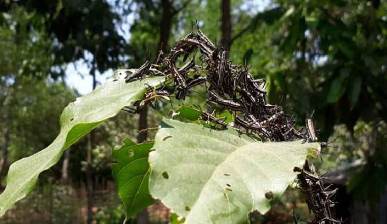 কক্সবাজারের টেকনাফ সদর ইউনিয়নের লম্বরী গ্রামের একাটি বাড়ির বাগানে পঙ্গপালের মতো ছোট পোকা গাছপালা খেয়ে ফেলছে। শত শত পোকা দল বেঁধে গাছের পাতা ও শাখায় বসে একের পর এক গাছের পাতা খেয়ে নষ্ট করছে। এ ঘটনায় বাড়ির মালিক সামাজিক যোগযোগ মাধ্যমে একটি ভিডিও পোস্ট করেন। আর পোকার এমন খবর ছড়িয়ে পড়লে জেলা কৃষি অফিসের পক্ষ থেকে ছবি তুলে কৃষি গবেষণাগারে পাঠানো হয়েছে। গতকাল বৃহস্পতিবার সরেজমিন দেখা গেছে, লতা পাতা, আগাছা থেকে শুরু করে শুকনো পাতা, কাঁচা পাতা ও গাছের শাখা-প্রশাখায় সারি সারি পোকা। কোথাও গাছের শাখা আছে পাতা নেই। আবার কোথাও পাতা ঝলসে গেছে। কোথাও পাতায় পোকায় খাওয়ার মত ছিদ্রযুক্ত। একটি গাছের নিচে রয়েছে কিছু ছাই। যা কিনা আগুন জ্বালিয়ে পোকা দমনের চেষ্টা করেও সরানো যায়নি। টেকনাফ সদর ইউনিয়নের লম্বরী গ্রামের সোহেল সিকদার জানান, গত কয়েকদিন ধরে ভিটের আম গাছের অবস্থা দেখতে গিয়ে তিনি দেখেন শত শত পোকা। আম গাছ, তেরশল গাছসহ অন্য বেশকটি গাছের পাতা নষ্ট হয়ে গেছে। কোথাও কোথাও শাখা ছাড়া কোনো পাতা নেই।আবার কোথাও কোথাও পাতা ঝলসে গেছে। তবে দিন দিন পোকার সংখ্যা যেমন বৃদ্ধি পাচ্ছে তেমনি পোকাগুলোর মধ্যে পাখাও দেখা যাচ্ছে। একটা আম গাছের নিচে ঝোপঝাড়ে আগুন ধরিয়ে দিয়ে পোকার আক্রমণ থেকে রক্ষার চেষ্টা করেও কাজ হয়নি। দিন দিন পোকার সংখ্যা বৃদ্ধি পাচ্ছে। এসব পোকা দেখতে পঙ্গপালের মতো। তিনি উপায় না দেখে পোকার ভিডিও সামাজিক যোগাযোগ মাধ্যমে ছড়িয়ে দেন। নাম প্রকাশে অনিচ্ছুক একজন কর্মকর্তা বলেন, পোকার ছবি দেখার পর কক্সবাজার জেলা অফিসে পাঠানো হয়েছিল। এটি দেখতে পঙ্গপালের মতো। পঙ্গপালের পাখা থাকে এবং সহজে উড়তে পারে। এটির তেমন পাখা দেখা যায়নি এবং এদিক ওদিক লাফাতে পারে। তবে যেহেতু কাঁচা পাতা খেয়ে ফেলছে তাই এটি ক্ষতিকর পোকা। এ প্রসঙ্গে টেকনাফ উপজেলা কৃষি সম্প্রসারণ কর্মকর্তা মো. হাদিউর রহমান  বলেন, এ পোকার নমুনা সংগ্রহ করে গবেষণাগারের পাঠানো হয়েছে। এখন পযন্ত সেখান থেকে কোনো নির্দেশনা পাওয়া যায়নি। এসব পোকা যাতে অন্য কোথাও ছড়িয়ে না পড়ে সে জন্য গতকালসহ কয়েকবার কিটনাশক স্প্রে করা হয়েছে। https://www.youtube.com/watch?v=Z0jqniRlTGQ