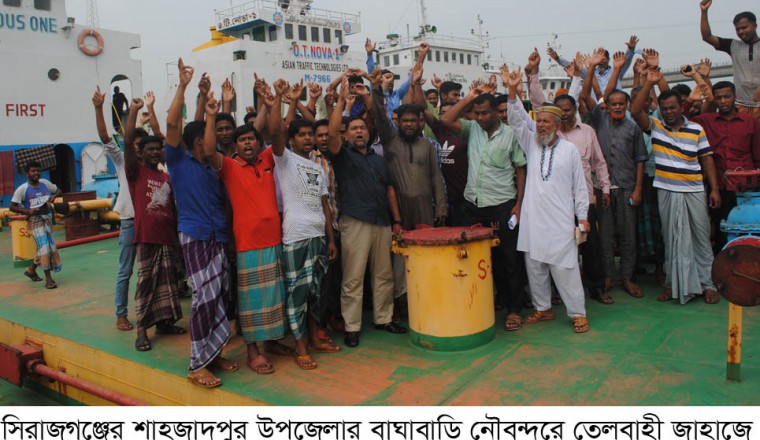 শাহজাদপুর (সিরাজগঞ্জ) প্রতিনিধিঃ সিরাজগঞ্জের শাহজাদপুর উপজেলার বাঘাবাড়ি নৌবন্দরে আজ রোববার সকালে ১ ঘন্টা কর্মবিরতি দিয়ে তেলবাহী ট্যাঙ্কার জাহাজ শ্রমিকরা বিক্ষোভ মিছিল ও প্রতিবাদ সমাবেশ করেছে। গত ২৮ মার্চ রাতে চাঁদপুর লঞ্চঘাট এলাকায় মেঘনা নদীতে ও, টি-আফসারা ওয়েল ট্যাঙ্কারে ডাকাতির ঘটনার প্রতিবাদ, অবিলম্বে ডাকাতদের গ্রেফতার করে দৃষ্টান্তমূলক শাস্তি প্রদান, নৌ পুলিশ ও কোস্টগার্ডের টহল জোরদার করার দাবীতে এ বিক্ষোভ সমাবেশের আয়োজন করা হয়। বাঘাবাড়ি নৌবন্দরে অবস্থিত প্রায় শতাধিক জাহাজের শ্রমিকরা ১ ঘন্টা কর্মবিরতি দিয়ে এম,টি প্রেসাস ওয়ান ওয়েল ট্যাঙ্কারের উপর বাঘাবাড়ি নৌযান শ্রমিক ফেডারেশন এ বিক্ষোভ মিছিল ও সমাবেশের আয়োজন করে। বাংলাদেশ নৌযান শ্রমিক ফেডারেশন,বাঘাবাড়ি নৌবন্দর শাখার সভাপিতি দাউদুল ইসলামের সভাপতিত্বে অনুষ্ঠিত সমাবেশে বক্তব্য রাখেন,বাংলাদেশ নৌযান শ্রমিক ফেডারেশন কেন্দ্রীয় কমিটির যুগ্ম সাধারণ সম্পাদক,আব্দুল ওয়াহাব মিয়া,আশুগঞ্জ শাখার যুগ্ম সাধারণ সম্পাদক শেখ সাহেদ আলী,নারায়ণগঞ্জ শাখার যুগ্ম সাধারণ সম্পাদক বাহারাম হোসেন, বাঘাবাড়ি নৌবন্দর শাখার যুগ্ম সাধারণ সম্পাদক আমিনুর রহমান,বাংলাদেশ লাইটারেজ শ্রমিক ইউনিয়ন চট্টগ্রাম শাখার সহ সভাপতি আনোয়ার হোসেন, জাহাঙ্গীর হোসেন, ইজাজুল ইসলাম, বাবুল হোসেন,বেল্লাল হোসেন, আব্দুল রহিম, রানা মিয়া, সায়মন হোসেন প্রমূখ। বক্তারা বলেন, গত ২৮ মার্চ রাত ২টার দিকে চট্টগ্রাম থেকে ছেড়ে আসা বাঘাবাড়ি নৌবন্দরগামী ও,টি-আফসারা ওয়েল ট্যাঙ্কার মেঘনা নদীর চাঁদপুর লঞ্চঘাট এলাকায় পৌছালে ১০/১২ জনের একটি ডাকাত দল একটি স্প্রীডবোর্টে করে এসে এ জাহাজে অতর্কিতে হামলা চালায়। এ সময় ডাকাত দল এ জাহাজের মাস্টার দাউদুল ইসলাম(৪৫), গ্রীজার জসিম উদ্দিন৫০), মমিন উদ্দিন(৩৩), বাবুর্চি মামুন মিয়া,  লষ্কর জিল্লুর রহমান(৩০) ও সোহাগ মিয়া(৩০)কে বেধরক পিটিয়ে গুরুতর আহত করে। এ ছাড়া এদের মাথায় বন্দুক ও গলায় হাসুয়া-রামদা ঠেকিয়ে হত্যার ভয় দেখিয়ে নগদ ৮৫ হাজার টাকা ৫টি দামি মোবাইল সেটসহ ২ লাখ টাকার মালামাল ডাকাতি করে নিয়ে যায়। তারা আরো বলেন, এ ডাকাতির ঘটনাস্থল থেকে নৌপুলিশ ও কোস্টগার্ডের ফাড়ির দূরত্ব মাত্র ৫০ থেকে ১০০ গজ। এর পরেও তাদের চিৎকারে তারা কেউ এগিয়ে আসেনি। তাদের অবহেলার কারণে এ ডাকাতির ঘটনা ঘটেছে। বক্তারা আরো বলেন, উত্তরাঞ্চলে জালানী তেল সরবরাহ স্বাভাবিক রাখতে দ্রুত জাহাজটি বাঘাবাড়ি নৌবন্দরে নিয়ে আসা হয়েছে। তবে ডাকাতির বিষয়টি তখন তখনই চাঁদপুর কোস্টগার্ড ও নৌপুলিশকে অবহিত করা হয়েছে। এরপরেও গত ৩দিন পার হয়ে গেলেও তারা এ ব্যাপারে কোন পদক্ষেপ নেয়নি। ফলে এ রুটে চলাচলকারী জা