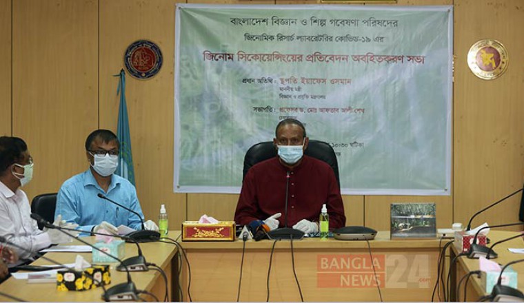 বাংলাদেশে করোনা ভাইরাসের (সার্স-কোভ-২) সংক্রমণ, মিউটেশনের হার, জিনগত বৈশিষ্ট্য, নন-সিনোনিমাস মিউটেশন এবং জেনোমিক ফাইলোজেনি পর্যবেক্ষণ করে দেশে পাঁচ ধরনের স্বতন্ত্র করোনা ভাইরাসের (কোভিড-১৯) অস্তিত্ব পাওয়া গেছে। যা বিশ্বের আর কোথাও পাওয়া যায়নি। রোববার (৭ সেপ্টেম্বর) সকালে বাংলাদেশ বিজ্ঞান ও শিল্প গবেষণা পরিষদ (বিসিএসআইআর) মিলনায়তনে বিসিএসআইআর জিনোমিক রিসার্চ ল্যাবরেটরির কোভিড-১৯ এর জিনোম সিকোয়েন্সিং প্রতিবেদন অবহিতকরণ সভা বিসিএসআইআরের চেয়ারম্যান অধ্যাপক ডা. মো. আফতাব আলী শেখ এ তথ্য জানান। এ সময় বিজ্ঞান ও প্রযুক্তি মন্ত্রণালয়ের মন্ত্রী স্থপতি ইয়াফেস ওসমানসহ বিসিএসআইআর জিনোমিক রিসার্চ ল্যাবরেটরির গবেষকরা উপস্থিত ছিলেন। মো. আফতাব আলী শেখ জানান, করোনা ভাইরাসের (করোনা ভাইরাস ডিজিজ-১৯ সংক্ষেপে কোভিড-১৯) জিনগত বৈচিত্র্য পর্যবেক্ষণ করার জন্য সার্স-কোভ-২ ভাইরাসের সর্বমোট ২৬৩টি জিনোম সিকোয়েন্সিং ও ডাটা বিশ্লেষণ করা হয়। এ নমুনা চলতি বছরের ৭ মে থেকে ৩১ জুলাই পর্যন্ত সংগ্রহ করা হয়। নমুনাগুলোর জিনোম সিকোয়েন্সিং করে আন্তর্জাতিক ডাটাবেজ Global Initiative on Sharing All Influenza Data (GISAID) তে প্রকাশ করা হয়। গবেষণা প্রতিবেদনে উল্লেখ করা হয়, সংগৃহীত নমুনায় শতভাগ ক্ষেত্রে আধিপত্যকারী ভ্যারিয়েন্টের G 414 (স্পাইক রুটিনে ৬১৪তম অবস্থানে অ্যাসপার্টিক গ্লাইসিন হওয়ার কারণ) উপস্থিতি পাওয়া যায়। প্রাপ্ত ২৬৩টি সার্স-কোভ-২ ভাইরাসের মধ্যে ২৪৩টি GR ক্লেড, ১৬টি G ক্লেড এবং ১টি O ক্লেডের অন্তর্ভুক্ত। এতে আরো উল্লেখ করা হয়, ২৬৩টি সার্স-কোভ-২ জিনোম বিশ্লেষণ করে জানা যায় যে সর্বমোট ৭৩৭টি পয়েন্টে মিউটেশন হয়। যার মধ্যে ৩৫৮টি নন সিনোনিমাস অ্যামিনো এসিড প্রতিস্থাপন ঘটায়। এখন পর্যন্ত প্রাপ্ত ২৬৩টি সার্স-কোভ-২ ভাইরাসের মিউটেশনের হার বার্ষিক ২৪ দশমিক ৬৪ নিউক্লিওটাইড। সারাবিশ্বে নমুনা প্রতি মিউটেশন হার ৭ দশমিক ২৩। যা বাংলাদেশের ক্ষেত্রে ১২ দশমিক ৬০ লক্ষ্য করা যায়‌। অর্থাৎ অন্য যে কোনো দেশের তুলনায় বাংলাদেশে সার্স-কোভ-২ ভাইরাসটি অনেক দ্রুত গতিতে এর রূপ পরিবর্তন করছে। স্পাইক প্রোটিনের জিনে ১০৩টি নিউক্লিওটাইড নিউটেশনের মধ্যে ৫৩টি নন সিনোনিমাস এমোনিয়া বেশি প্রতিস্থাপন ঘটে, যার মধ্যে পাঁচটি স্বতন্ত্র। যা বিশ্বের আর কোথাও পাওয়া যায়নি। সংগৃহীত নমুনা সময়ের মধ্যে ১০০ ভাগ ক্ষেত্রে চারটি নিউটেশনের পুনরাবৃত্তি লক্ষ্য করা যায়। বিসিএসআইআররের চেয়ারম্যান বলেন, চলমান বৈশ্বিক কোভিড-১৯ মহামারিতে সারাবিশ্বের বিজ্ঞানীরা সার্স-কোভ-২ ভাইরাসের উৎস, গতি প্রকৃতি ও বিস্তার নির্ণয়ের পাশাপাশি এ ভাইরাসের ওষুধ ও ভ্যাকসিনের ওপর গবেষণা করছেন। সে লক্ষ্যে বাংলাদেশেও সার্স-কোভ-২ ভাইরাসের জ