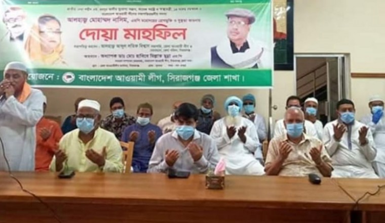 জাতীয় নেতা শহীদ এম মনসুর আলীর সন্তান, সাবেক স্বরাষ্ট্র ও স্বাস্থ্যমন্ত্রী, ১৪ দলের সমন্বয়ক ও আওয়ামী লীগের প্রেসিডিয়াম সদস্য হাসপাতালে চিকিৎসাধীন মোহাম্মদ নাসিম এমপি'র রোগমুক্তি ও সুস্থতা কামনায় সিরাজগঞ্জ জেলা আওয়ামী লীগের উদ্যোগে দোয়া মাহফিল অনুষ্ঠিত হয়েছে। বুধবার বাদ যোহর সিরাজগঞ্জ শহরের এস. এস. রোডস্থ জেলা আওয়ামী লীগ কার্যালয়ে দোয়া মাহফিলে সভাপতিত্ব করেন জেলা আওয়ামী লীগের সভাপতি ও জেলা পরিষদ চেয়ারম্যান আলহাজ্ব আব্দুল লতিফ বিশ্বাস ও পরিচালনা করেন ভারপ্রাপ্ত সাধারণ সম্পাদক অধ্যাপক ডাঃ মো. হাবিবে মিল্লাত মুন্না এমপি। দোয়া মাহফিলে মোনাজাত পরিচালনা করেন সিরাজগঞ্জ ফায়ার সার্ভিস জামে মসজিদের পেশ ইমাম মাওলানা মো. শরীফুল আলম। মাস্ক ব্যবহারসহ স্বাস্থ্যবিধি মেনে দোয়া মাহফিলে অংশ নেন সিরাজগঞ্জ জেলা আওয়ামী লীগের সহ-সভাপতি আবু ইউসুফ সূর্য, অ্যাডভোকেট কে. এম হোসেন আলী হাসান, অ্যাডভোকেট বিমল কুমার দাস, মোস্তফা কামাল খান, হাজী ইসহাক আলী, পৌর আওয়ামীলীগের সভাপতি হেলাল উদ্দিন, সাধারণ সম্পাদক মো. দানিউল হক দানী, জেলা যুবলীগের সাধারণ সম্পাদক মোঃ একরামুল হক, জেলা স্বেচ্ছাসেবকলীগের সভাপতি নুরুল ইসলাম সজল, সাধারণ সম্পাদক জিহাদ আল ইসলাম, জেলা ছাত্রলীগের সভাপতি আহসান হাবিব খোকা, জেলা কৃষকলীগের সাধারণ সম্পাদক মো. মনিরুজ্জামান মনিসহ আওয়ামীলীগ, যুবলীগ, ছাত্রলীগ, স্বেচ্ছাসেবকলীগ, কৃষকলীগসহ সকল অঙ্গ-সহযোগী সংগঠনের নেতৃবৃন্দ। এছাড়াও বুধবার বাদ যোহর সিরাজগঞ্জ সদর উপজেলাসহ ৯টি উপজেলার বিভিন্ন মসজিদ ও ধর্মীয় উপাসনালয়গুলোতে মোহাম্মদ নাসিম এমপির রোগ মুক্তি ও সুস্থতা কামনায় বিশেষ দোয়া মাহফিলের আয়োজন করা হয়।