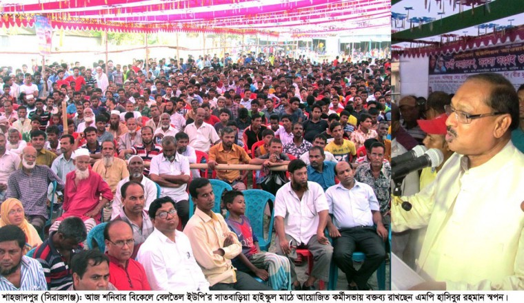 শামছুর রহমান শিশির: স্থানীয় সংসদ সদস্য আলহাজ্ব হাসিবুর রহমান স্বপন এমপি বলেছেন, ‘দেশের উন্নয়ন, শান্তি, সমৃদ্ধি ও নৈতিকতার পথ অবলম্বন করতে জাতির পিতা বঙ্গবন্ধু শেখ মুজিবুর রহমানের আদর্শের নৌকা প্রতীককে বিজয়ী করার বিকল্প নেই। বিপদগ্রস্থ রোহিঙ্গাদের আশ্রয় দিয়ে প্রধানমন্ত্রী শেখ হাসিনা বিশ্ব পরিমন্ডলে শান্তির প্রতীক হিসেবে পরিচিতি লাভ করেছেন। দেশের সকল খাতে উন্নয়ণের ধারাবাহিকতা রক্ষা ও ত্বরান্বিত করে যেমন বিশ্ববাসীকে তিনি তাক লাগিয়ে দিয়েছেন। তেমনি সফল রাষ্ট্রনায়ক প্রধানমন্ত্রী শেখ হাসিনা এখন বিশ্ব শান্তিতেও প্রশংসনীয় ভুমিকা রেখে চলেছেন। তাই আগামী নির্বাচনে উন্নয়নের প্রতীক নৌকাকে বেছে নিয়ে শেখ হাসিনাকেই আবারও প্রধানমন্ত্রী নির্বাচিত করতে হবে। সে লক্ষ্যেই পুরো জাতি এখন ঐক্যবদ্ধ।’ আজ শনিবার বিকেলে শাহজাদপুর উপজেলার বেলতৈল ইউনিয়নের সাতবাড়িয়া হাইস্কুল মাঠে বিশাল কর্মী সমাবেশ, সদস্য সংগ্রহ ও সদস্য নবায়ন উপলক্ষে আয়োজিত অনুষ্ঠানে প্রধান অতিথি’র বক্তব্যে স্থানীয় এমপি আলহাজ্ব হাসিবুর রহমান স্বপন উপরোক্ত কথাগুলো বলেছেন। বেলতৈল ইউপি চেয়ারম্যান ফেরদৌস হোসেন ফুলের সভাপত্বিতে অনুষ্ঠিত ওই সভায় অন্যান্যের মধ্যে বক্তব্য রাখেন, শাহজাদপুর উপজেলা পরিষদ চেয়ারম্যান প্রফেসর আজাদ রহমান, ভাইস চেয়ারম্যান মুস্তাক আহমেদ, পৌরমেয়র (দায়িত্বপ্রাপ্ত) নাসির উদ্দিন, আওয়ামী লীগ নেতা রফিকুল ইসলাম বাবলা, শামসুল আলম, সাবেক ভিপি আব্দুর রহিম, আমিরুল ইসলাম শাহু, ফারুক সরকার, মাজেদ আলী, মোশাররোফ হোসেন, সাহেব আলী, আশিকুল হক দিনার, ইসলাম শেখ প্রমূখ। অনুষ্ঠানটি পরিচালনা করেন ইসমাইল হোসেন সুমন। বিভিন্ন এলাকা থেকে খন্ড খন্ড মিছিল এসে ওই কর্মীসভা বিশাল জনসভায় রূপ নেয়। এর আগে এদিন সকালে স্থানীয় এমপি আলহাজ্ব হাসিবুর রহমান স্বপন ৫ শতাধিক মোটর সাইকেল নিয়ে শোভাযাত্রার অংশ হিসেবে নগরডালা, ডায়া, পোরজনা, ছোটমহারাজপুর, বড়মহারাজপুর, কৈজুরী, খুকনী, জালালপুর, সৈয়দপুর বাজার, এনায়েতপুর হাট চত্বর ওই ১০ স্থানে সংক্ষিপ্ত পথসভায় অংশ নেন। এদিন দুপুরে জালালপুরের সৈয়দপুর বাজার এবং এনায়েতপুর হাট চত্বরে আয়োজিত পথসভায় প্রধান অতিথি হিসেবে উপস্থিত ছিলেন তিনি। এ সময় জালালপুর ইউনিয়ন পরিষদ চেয়ারম্যান ও ইউনিয়ন আওয়ামী লীগের সভাপতি হাজী সুলতান মাহমুদের সভাপতিত্বে সেখানে আয়োজিত পথসভায় অন্যান্যের মধ্যে বক্তব্য রাখেন আওয়ামী লীগ নেতা আব্দুল হাই, ইউপি চেয়ারম্যান মুল্লুক চাঁদ মিয়া, সাইফুল ইসলাম, আফাজ উদ্দিন ব্যাপারী, শাহাদত হোসেন প্রমুখ।