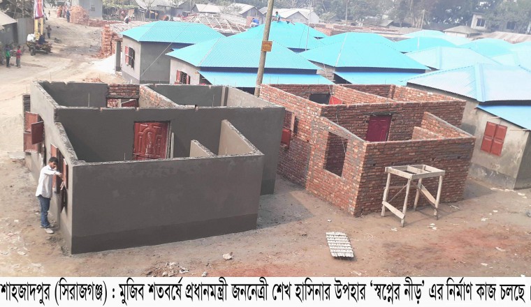 মোঃ আবুল কাশেম ও মোঃ শামছুর রহমান শিশির, শাহজাদপুর (সিরাজগঞ্জ) থেকে : মুজিববর্ষ উপলক্ষে দরিদ্র ভূমি ও গৃহহীনদের জন্য নির্মিত হচ্ছে প্রধানমন্ত্রী শেখ হাসিনার দেয়া উপহার ‘স্বপ্ন নীড়’। মুজিববর্ষ উপলক্ষে ১ শ’ ৫০টি পরিবারের জন্য ঘর তৈরির কাজ প্রায় ৮০ শতাংশ সম্পন্ন হয়েছে। তালিকাভুক্ত গৃহহীন পরিবারগুলোর মুখে এখন হাসি ফুটে উঠেছে মুজিববর্ষের এই উপহারে। দিনের পর দিন আনন্দ ভরা স্বপ্ন নিয়ে অপেক্ষার প্রহর গুনছে দেড় শতাধিক পরিবার। আগামী ২৩ জানুয়ারি প্রধানমন্ত্রী জননেত্রী শেখ হাসিনার উদ্বোধনের মধ্য দিয়ে তালিকাভুক্ত গৃহহীনদের মাঝে প্রদান করা হবে প্রধানমন্ত্রীর দেওয়া মুজিববর্ষের এই উপহার ‘স্বপ্ন নীড়’। নির্মাণাধীন ঘরগুলো সার্বিকভাবে তদারকি করছেন শাহজাদপুর উপজেলা নির্বাহী কর্মকর্তা শাহ মোঃ শামসুজ্জোহা, সহকারী কমিশনার (ভুমি) মোঃ মাসুদ হোসেন ও উপজেলা প্রকল্প বাস্তবায়ন কর্মকর্তা প্রকৌশলী আবুল কালাম আজাদ। শাহজাদপুর উপজেলা প্রশাসনের পক্ষ থেকে জানা গেছে, জাতীর জনক বঙ্গবন্ধু শেখ মুজিবুর রহমানের জন্ম শতবর্ষ উপলক্ষে ভ‚মি ও গৃহহীন পরিবারের জন্য চলতি অর্থ বছরে শাহজাদপুর উপজেলার ৫টি ইউনিয়নে দেড় শতাধিক ঘর নির্মাণ করা হচ্ছে। রুপবাটি ইউনিয়নে ৪০টি, পোতাজিয়া ইউনিয়নে ৪০টি, গাঁড়াদহ ইউনিয়নে ৪০টি, হাবিল্লাহনগর ইউনিয়নে ২০টি, কৈজুরী ইউনিয়নে ১০টি ঘর বরাদ্দ দেয়া হয়েছে। এই ঘরগুলো তৈরীর কাজ দ্রুত গতিতে এগিয়ে চলেছে। ২০ ফুট প্রস্থ ও ২২ ফুট দৈর্ঘ্যরে দুই কক্ষ বিশিষ্ট এই বাড়ী গুলোর সাথে সংযোজিত থাকছে একটি রান্না ঘর, শৌচাগার ও সামনে খোলা বারান্দা। প্রতিটি ঘর নির্মাণে বরাদ্দ দেয়া হয়েছে ১ লাখ ৭১ হাজার টাকা। এরই মধ্যে কাজের অগ্রগতি প্রায় শেষের দিকে। আগামী ২৩ জানুয়ারির মধ্যে ঘরগুলো গৃহহীনদের মাঝে বুঝিয়ে দেয়া হবে। সরজমিনে গিয়ে রূপবাটি ইউনিয়নের বাঘাবাড়ী ঘাটের পশ্চিমপাড়ে নির্মাণাধীন বাড়ী গুলোর বিষয়ে বাসিন্দা শ্রমিক আব্দুল মান্নান ও কলেজ পড়ুয়া ছাত্র আব্দুল্লাহ আল-মাহমুদ জানান, প্রথম অবস্থায় অত্যন্ত নিম্নমানের সামগ্রী দিয়ে বাড়ীগুলো নির্মাণ করা হয়েছে। এখন অনেকটা ভালো মানের সামগ্রী দিয়ে বাড়ীগুলো নির্মাণ করা হচ্ছে। উপজেলা প্রকল্প কর্মকর্তা প্রকৌশলী আবুল কালাম আজাদ জানান, গরীবের সপ্নের ঘর তৈরিতে তারা ব্যস্ত। মানসম্মত ঘর দরিদ্র ও ভূমিহীনদের মাঝে তুলে দেওয়াই এখন তাদের মুল লক্ষ্য। সহকারী কমিশনার (ভুমি) মোঃ মাসুদ হোসেন জানান,সরকারী নির্দেশনা মোতাবেক নির্ধারিত সময়ের মধ্যে সকল কাজ সম্পন্ন হবে এমন প্রত্যাশা আমাদের। শাহজাদপুর উপজেলা নির্বাহী কর্মকর্তা শাহ মোঃ শামসুজ্জোহা জানান, মুজিব বর্ষ উপলক্ষে সরকার কর্তৃক প্রদেয় এই 