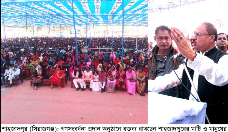 শামছুর রহমান শিশির, শাহজাদপুর (সিরাজগঞ্জ) থেকে : একাদশ জাতীয় সংসদ নির্বাচনে বিপুল ভোটে বিজয়ের পরে গতকাল শনিবার শাহজাদপুর সরকারি মডেল পাইলট উচ্চ বিদ্যালয় মাঠে শাহজাদপুর উপজেলা আওয়ামী লীগ আয়োজিত গণসংবর্ধনা অনুষ্ঠানে ১০ সহ¯্রাধিক জনতার উপস্থিতিতে দেয়া গণসংবর্ধনায় ভালবাসায় সিক্ত হলেন সংবর্ধিত নেতা শাহজাদপুরের মাটি ও গণমানুষের নেতা স্থানীয় এমপি বীরমুক্তিযোদ্ধা আলহাজ্ব হাসিবুর রহমান স্বপন। প্রিয় এ নেতাকে ফুলেল শুভেচ্ছা জানালেন দলীয় নেতাকর্মীসহ শাহজাদপুরের সর্বস্তরের সাধারণ মানুষ ও স্থানীয় সকল পেশাজীবী সংগঠনের নেতৃবৃন্দ। ওই গণসংবর্ধনা অনুষ্ঠানে মাননীয় প্রধানমন্ত্রী, সফল রাষ্ট্রনায়ক, দেশরতœ শেখ হাসিনা সমীপে দলীয় নেতাকর্মীসহ শাহজাদপুরের হাজার হাজার আমজনতার মুখে আরেকটি দাবী পূরণের জন্য জোরালো ভাবে তাদের কন্ঠে উত্থাপিত হয়েছে । গণসংবর্ধনা অনুষ্ঠানের সকল বক্তাদের দেয়া বক্তব্যে ও শাহজাদপুরের সর্বস্তরের মানুষের দেয়া ভাষ্যমতে, ‘মাননীয় প্রধানমন্ত্রী জননেত্রী শেখ হাসিনা শাহজাদপুরবাসীর দাবীর প্রেক্ষিতে শাহজাদপুরে এসে শাহজাদপুরে আন্তর্জাতিক মানের রবীন্দ্র বিশ্ববিদ্যালয় ভিত্তিপ্রস্তর স্থাপন করে শাহজাদপুরবাসীকে দেয়া তাঁর ওয়াদা পূরণ করেছেন। রবীন্দ্র বিশ্ববিদ্যালয়ের সেই ভিত্তিপ্রস্তর স্থাপন অনুষ্ঠানে শাহজাদপুরের মাটি ও মানুষের বলিষ্ঠ কন্ঠস্বর, আওয়ামী লীগের সাবেক শিল্প-উপমন্ত্রী, বীরমুক্তিযোদ্ধা আলহাজ্ব হাসিবুর রহমান স্বপন শাহজাদপুরবাসীর পক্ষ থেকে মাননীয় প্রধানমন্ত্রীকে আশ্বস্ত করে বলেছিলেন, যেহেতু মাননীয় প্রধানমন্ত্রী শাহজাদপুরাসীকে রবীন্দ্র বিশ্ববিদ্যালয় দিয়েছেন, সেহেতু; শাহজাদপুরের এ আসনটিও মাননীয় প্রধানমন্ত্রীকে ভবিষ্যতে সকল নির্বাচনে উপহার দেবে শাহজাদপুরবাসী। একাদশ জাতীয় সংসদ নির্বাচনসহ শাহজাদপুরে অনুষ্ঠিত সকল নির্বাচনে কৃতজ্ঞ শাহজাদপুরবাসী মাননীয় প্রধানমন্ত্রীকে দেয়া ওয়াদা কেবল রক্ষাই করেননি! এবারের একাদশ জাতীয় সংসদ নির্বাচনে রাজশাহী বিভাগের সকল সংসদীয় আসনের মধ্যে সর্বাধিক ভোট দিয়ে অর্থাৎ শাহজাদপুর সংসদীয় আসনের প্রার্থী জননেতা হাসিবুর রহমান স্বপনকে নৌকা প্রতীকে ৩ লাখ ৩৫ হাজার ৬’শ ৯৭ ভোট দিয়ে প্রথম এবং সারা দেশের মধ্যে আওয়ামী লীগের নির্বাচিত ২’শ ৪২ টি সংসদীয় আসনের মধ্যে ৪র্থ স্থান অর্জন করিয়ে মাননীয় প্রধানমন্ত্রীকে দেয়া ওয়াদার ষোলকলাই পূর্ণ করেছেন। বিগত সময়ে মাননীয় প্রধানমন্ত্রী জননেত্রী শেখ হাসিনা শাহজাদপুরবাসীর প্রিয় নেতা হাসিবুর রহমান স্বপনের যোগ্য নেতৃত্বের কারণে যেমন আওয়ামী লীগ সরকারের শিল্প-উপমন্ত্রী পদে আসীন করেছিলেন, ঠিক তেমনি শ