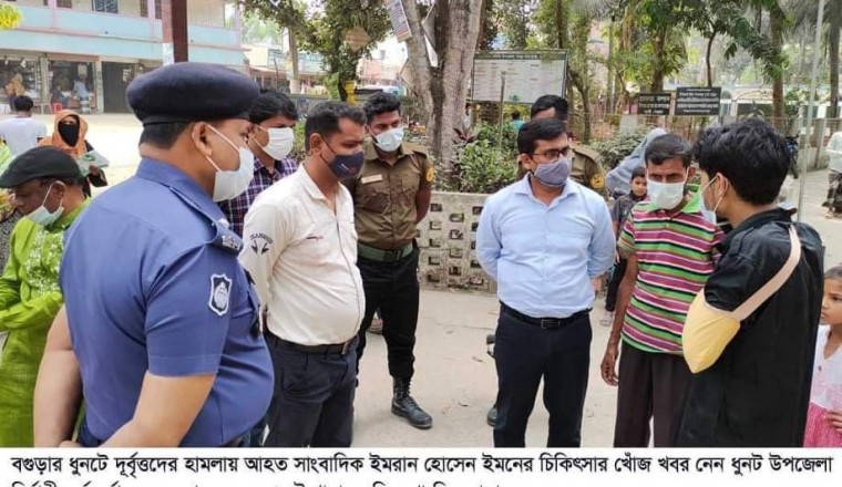 বগুড়ার ধুনটে পেশাগত কাজ শেষে মোটরসাইকেলযোগে বাড়ি ফেরার পথে সাংবাদিক ইমরান হোসেন ইমনকে (৩২) পিটিয়ে হাত ভেঙ্গে দিয়েছে দূর্বৃত্তরা। ২৯ শে মার্চ (মঙ্গলবার) রাত্রি ১১ টার দিকে উপজেলার ধুনট-সোনামুখী সড়কের বেলকুচি গ্রামের পাকা রাস্তার উপর এঘটনা ঘটে। আহত ইমরান হোসেন ইমন উপজেলার চৌকিবাড়ী গ্রামের মৃত আমির হোসেন মাষ্টারের ছেলে এবং তিনি যায়যায়দিন পত্রিকার ধুনট প্রতিনিধি ও অনুসন্ধান বার্তা অনলাইন পত্রিকার সম্পাদক ও প্রকাশক। জানাগেছে, মঙ্গলবার রাত ১১ টার দিকে ধুনট মডেল প্রেসক্লাবের সভাপতি ইমরান হোসেন ইমন অফিসের কাজ শেষে মোটরসাইকেলযোগে বাড়ির উদ্দেশ্যে রওনা দেন। পথিমধ্যে ধুনট-সোনামুখী সড়কের বেলকুচি গ্রামের পাকা রাস্তার উপর পৌঁছালে সাংবাদিক ইমনকে পিছন থেকে একটি মোটরসাইকেলের উপর কয়েক যুবক তাকে পিটিয়ে রাস্তার উপর ফেলে রেখে যায়। এতে সাংবাদিক ইমনের বাম হাত ভেঙ্গে গুরুতর আহত হন। পরে স্থানীয়রা তাকে উদ্ধার করে ধুনট উপজেলা স্বাস্থ্য কমপ্লেক্সে ভর্তি করেন। সাংবাদিক ইমরান হোসেন ইমন জানান, অফিসের কাজ শেষে বাড়ি ফেরার পথে পিছন থেকে চলন্ত মোটরসাইকেলের উপর অতর্কিতভাবে দূর্বৃত্তরা হামলা চালায়। এতে বাম হাতের কবজি ফেটে যায়। এঘটনায় থানায় মামলা দায়েরের প্রস্ততি চলছে বলে জানান তিনি। এদিকে সংবাদ পেয়ে বুধবার সকালে ধুনট উপজেলা নির্বাহী কর্মকর্তা সঞ্জয় কুমার মহন্ত, ধুনট থানার (ওসি) কৃপা সিন্ধু বালা, ধুনট প্রেসক্লাবের সভাপতি সাংবাদিক রফিকুল আলম,ধুনট মডেল প্রেসক্লাবের সাধারণ সম্পাদক সাংবাদিক এম.এ রাশেদ সহ অন্যান্য সাংবাদিক ও থানা পুলিশ ধুনট হাসপাতালে গিয়ে সাংবাদিক ইমনের চিকিৎসার খোঁজ খবর নেন। এবিষয় ধুনট থানার অফিসার ইনচার্জ (ওসি) কৃপা সিন্ধু বালা বলেন, সংবাদ পেয়ে রাতেই ঘটনাস্থল পরিদর্শন করা হয়েছে। এঘটনার সাথে জড়িতদের গ্রেফতার করতে ইতিমধ্যেই পুলিশ মাঠে নেমেছে।