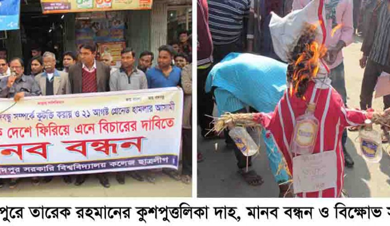 শাহজাদপুর প্রতিনিধিঃ বঙ্গবন্ধু শেখ মুজিবর রহমান সম্পর্কে বিএনপি’র সিনিয়র ভাইস চেয়ারম্যান তারেক রহমানের কটুক্তির প্রতিবাদে আজ মঙ্গলবার শাহজাদপুরে মানববন্ধন কর্মসূচি পালন করা হয়। শাহজাদপুর সরকারি কলেজ ছাত্রলীগ এ মানববন্ধন কর্মসূচির আয়োজন করে। পৌর সদরের প্রাণকেন্দ্র মনিরামপুর বাজারের চৌরাস্তা মোড়ে সকাল ১১টা থেকে দুপুর ১২টা পর্যন্ত এ মানববন্ধন কর্মসূচি পালিত হয়। ঘন্টাব্যাপী এ কর্মসূচি চলাকালে বক্তব্য রাখেন উপজেলা পরিষদের চেয়ারম্যান ও উপজেলা আওয়ামী লীগের সাধারণ সম্পাদক প্রফেসর আজাদ রহমান, আওয়ামী লীগ নেতা রাশেদুল হাসান জাফর, মুস্তাক আহমেদ, আমিরুল ইসলাম শাহু, ছাত্রনেতা শেখ কাজল, রাশেদ, নেছারুল, সাবেক ছাত্রনেতা আব্দুল আউয়াল, যুবনেতা রাজিব শেখ, শ্রমিক নেতা আবু সাঈদ ও ইসলাম আলী। বক্তারা অবিলম্বে তারেক রহমানকে দেশে ফিরিয়ে এনে গ্রেফতার ও দৃষ্টান্তমূলক শাস্তির দাবি জানান। মানববন্ধন শেষে তারেক রহমানের কুশপুত্তলিকা দাহ করা হয়।